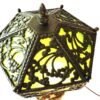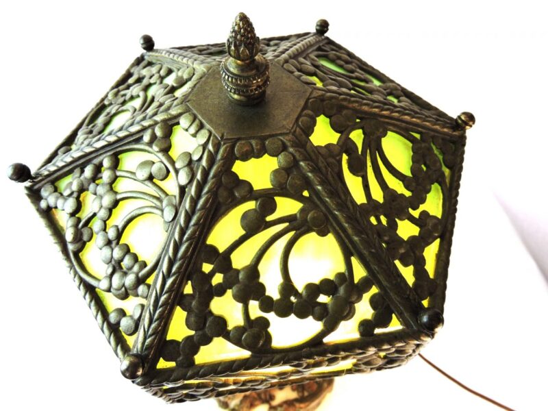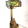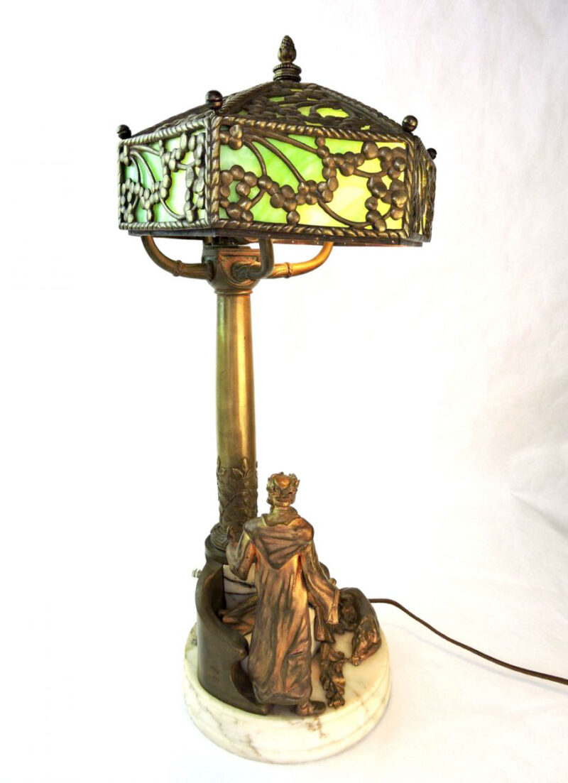 v** SOLD ARCHIVES **vHere is a Viennese bronze and white marble Orientalist figural multi-branch lamp with a patterned bronze and green slag glass shade.