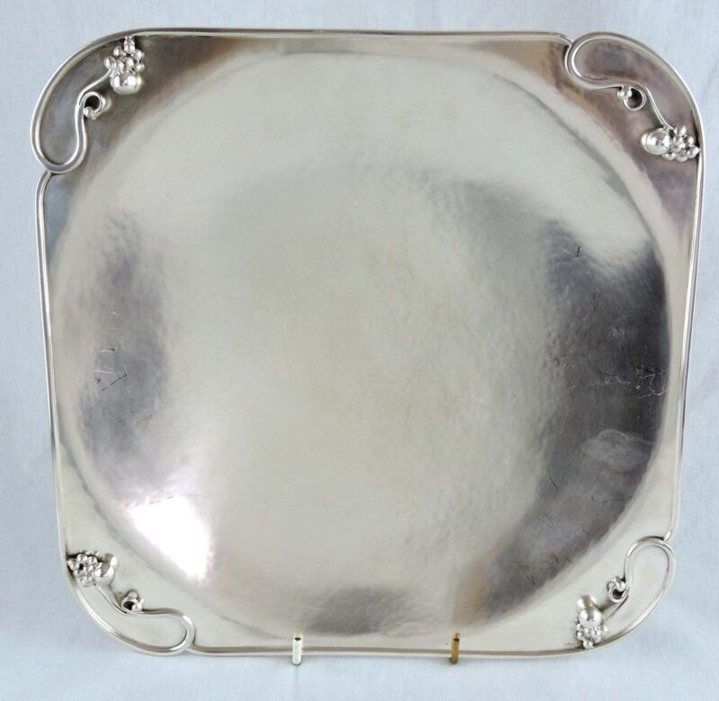 A wonderful and unusual square tray on pedestal by Canadian Silversmith Carl Poul Petersen.  Petersen was trained by Georg Jensen and later became his son-in-law.