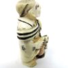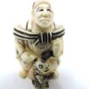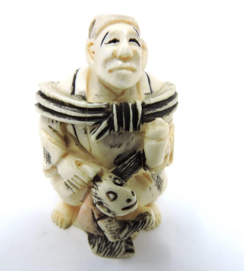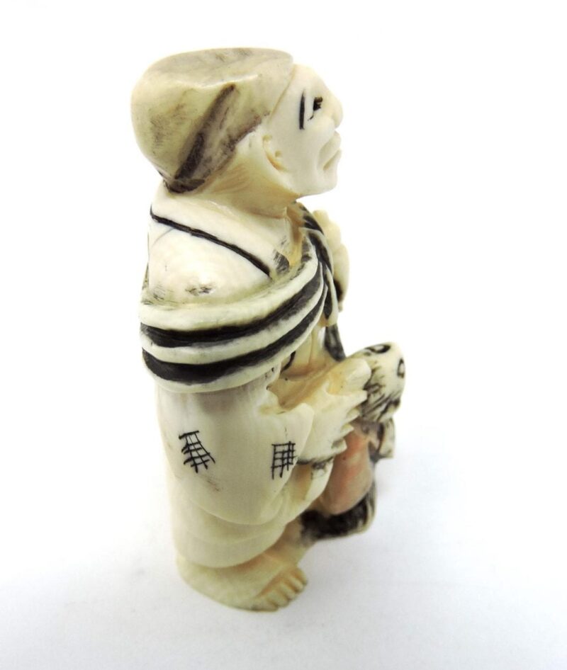 Carved Japanese Ivory Netsuke of a Standing Man Holding a Covered Urn, Knife & Monkey. circa 1900