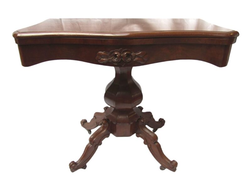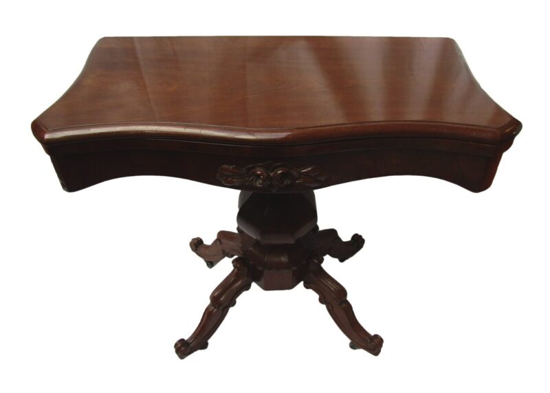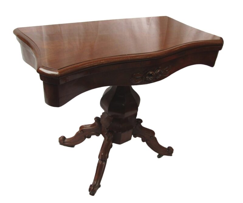 A handsome carved mahogany fold over games table with green baize interior covering. There are 4 curved legs from a central pedestal and there is a carving of flowers and leaves on the front of the table.
