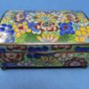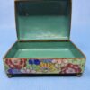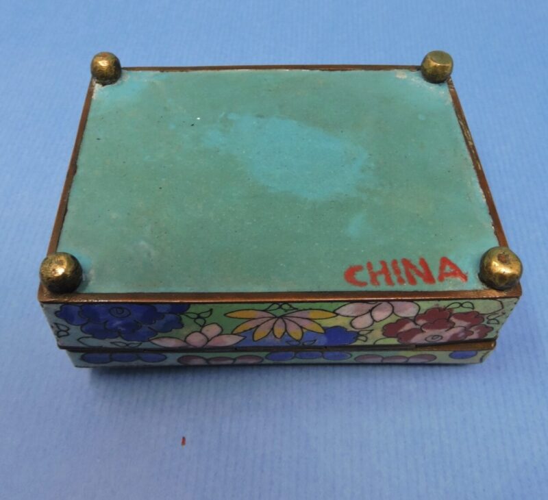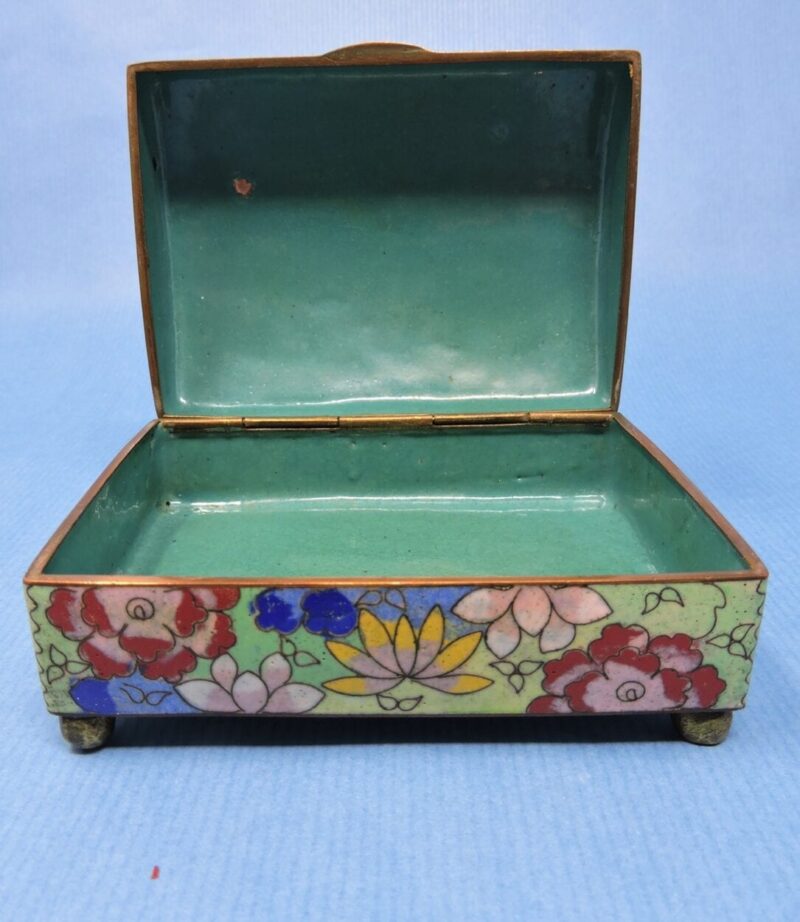 The interior and underside of the box are a bright turquoise blue. Please note that there is one small ding to the interior showing the copper underneath the cloisonné. (please see the third photo in the gallery).
