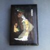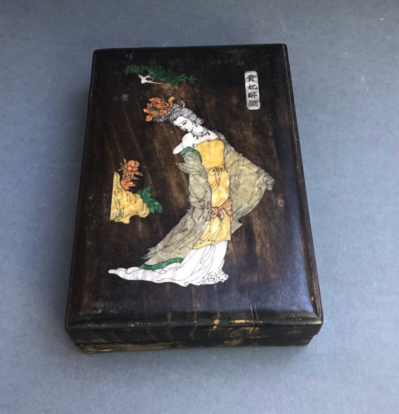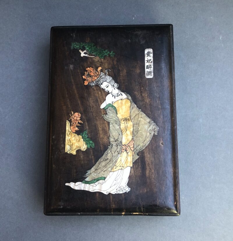 This lovely Chinese ink stone dates from the late Qing Dynasty, and has a reservoir used for ink. The stone is encased in a decorative wooden box that has a beautiful inlaid depiction of a woman in mother of pearl and other stones. The inkstone itself has Chinese writing carved into it.  The stone is very heavy for its size and fits perfectly into the box.