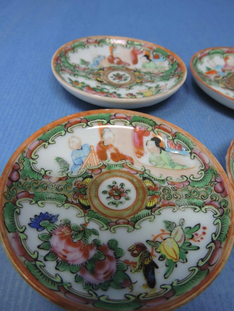 Oriental / AsianA lovely set of 6 small Chinese painted porcelain butter pats in the “Famille Rose” pattern. Each pat has a white background, exterior and underside. They are wonderfully decorated with colourful scenes of figures, fruit, flowers and leaves as well as birds. The butter pats were manufactured for export to the European market.