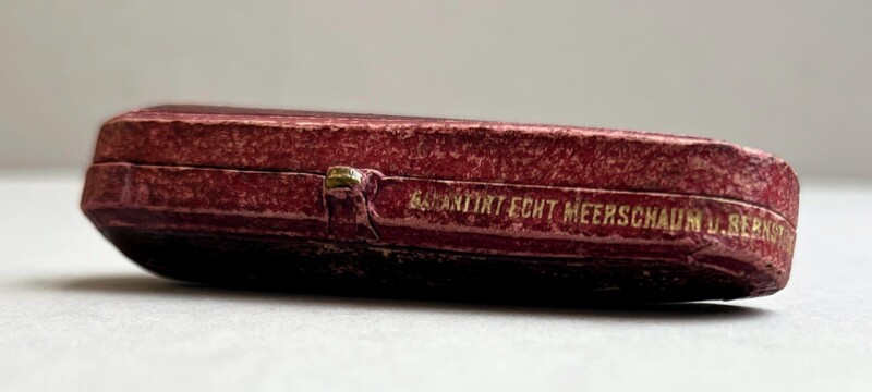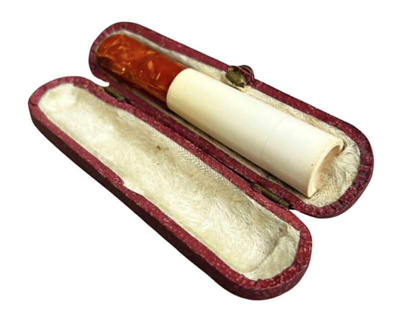 General, Gift IdeasAntique butterscotch amber and meerschaum cheroot holder in its original case. Meerschaum is German for “sea foam”, a rock made of sea shells / sea creatures originally found on beaches. Lovely piece of butterscotch amber chosen for this piece with both light and dark shades reflecting the light. Made for “cheroots” or small cigars open at both ends, rather than cigarettes. The case is in very good condition with the original hinges, white plush interior and leather exterior marked in German “Meerschaum…”. A conversation piece that is in great condition and considering its age, it could no doubt tell a few stories!