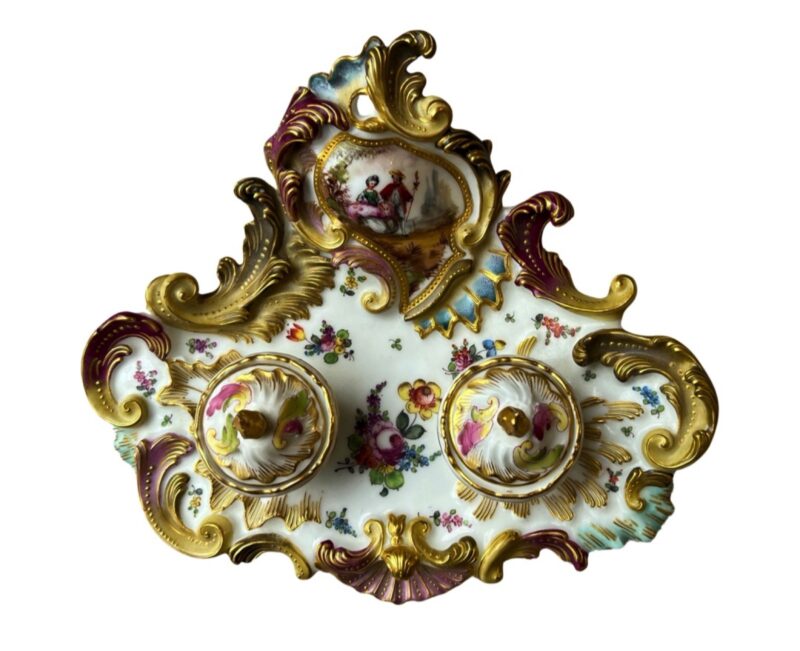 Circa 1850 Dresden Meissen style inkwells (2) with lids, all integrated on a hand painted porcelain base in a floral motif, elaborately framed with gold accents . The blue mark is the Meissen swords with a dot. Sophisticated colour intensity and designed with a raised “centre painting” of an amorous couple in a garden. Both inkwells and their lids are in excellent condition  and are integrated flawlessly in this beautiful and rare piece.  Exceptional “eye candy” for your desk or dresser and to possibly house special treasures!
