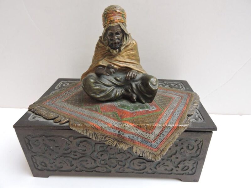 v** SOLD ARCHIVES **vA Cold Painted Austrian Bronze Tobacco Box – Arab Man Sitting on Carpet
