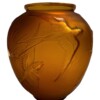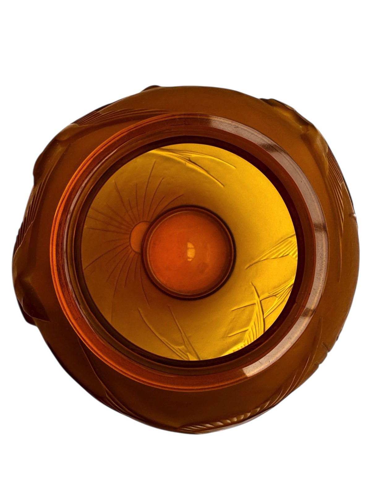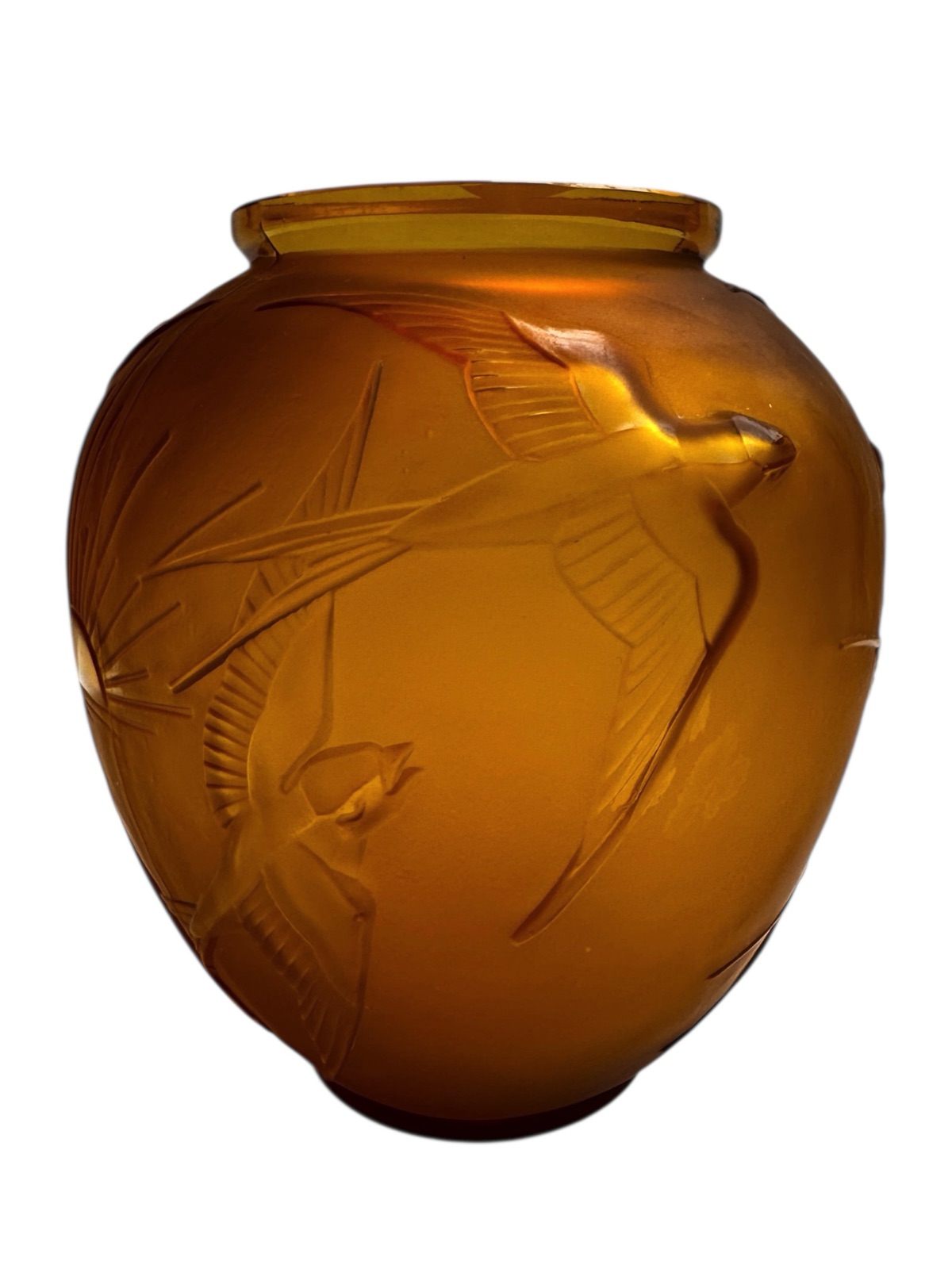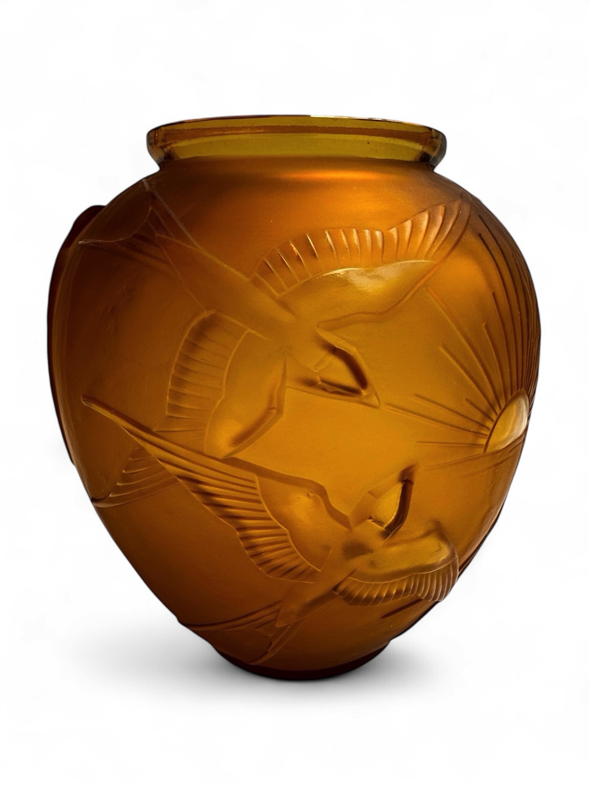 This eternally chic Sabino art glass vase showcases the characteristic geometric shapes and motifs of the Art Deco period, namely the “setting sun” and flying “hirondelles” or translated “swallow birds” images. The subtle honey yellow coloured pressed glass with satin finish is in excellent condition, circa 1928 and engraved to the base : Sabino Paris France