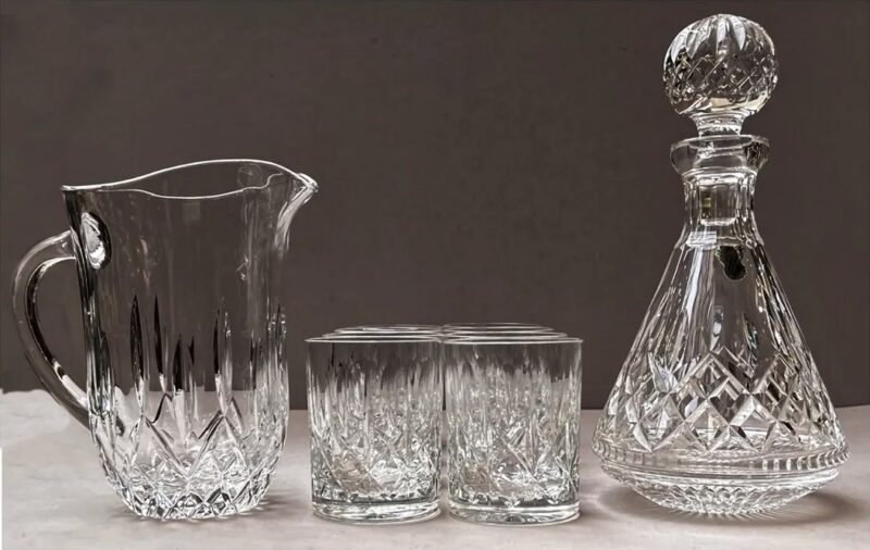 Sip and savour your favourite whiskey as it is intended with this elegant set of 8 old fashion crystal tumbler glasses, decanter and pitcher created in brilliant fine crystal. The decanter is marked Waterford and intricately adorned with the iconic diamond and wedge cuts of  Waterford’s famous Lismore pattern. Created in excellence to be enjoyed by all who appreciate this legendary spirit.