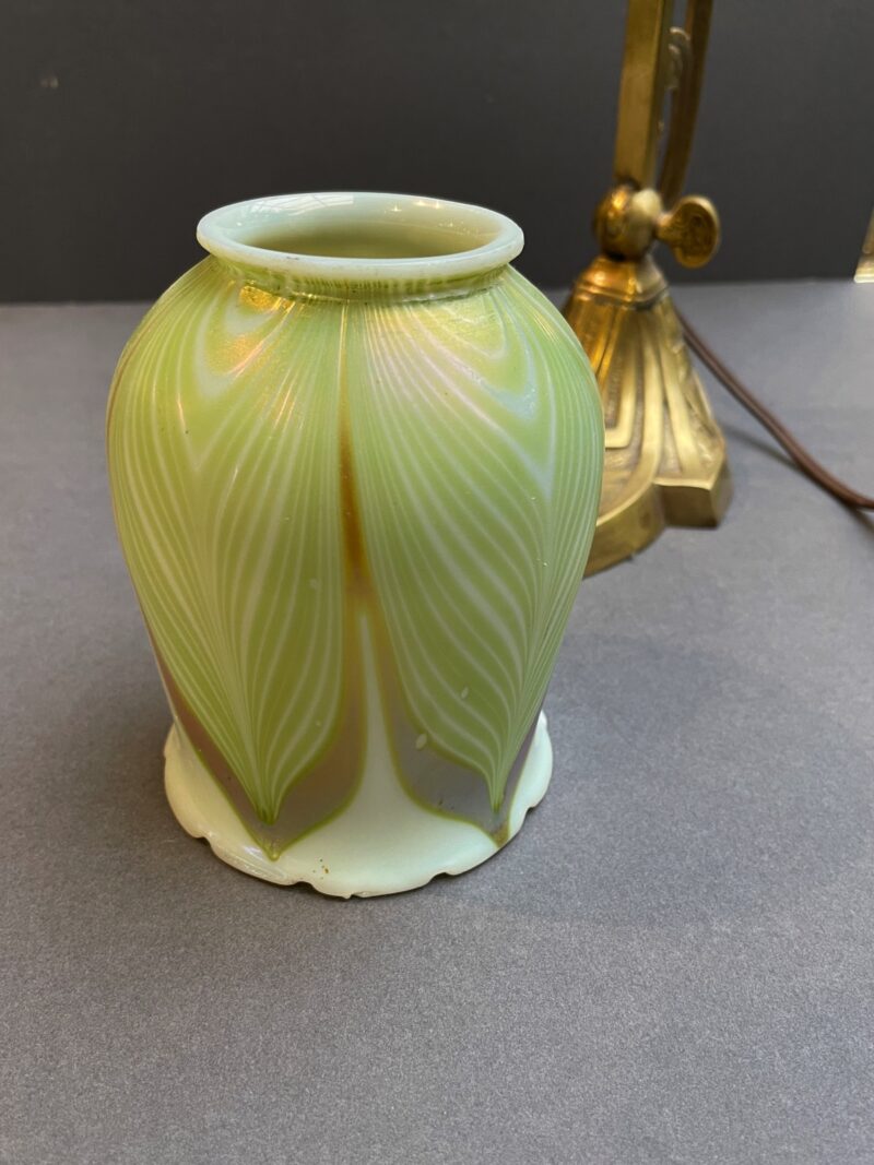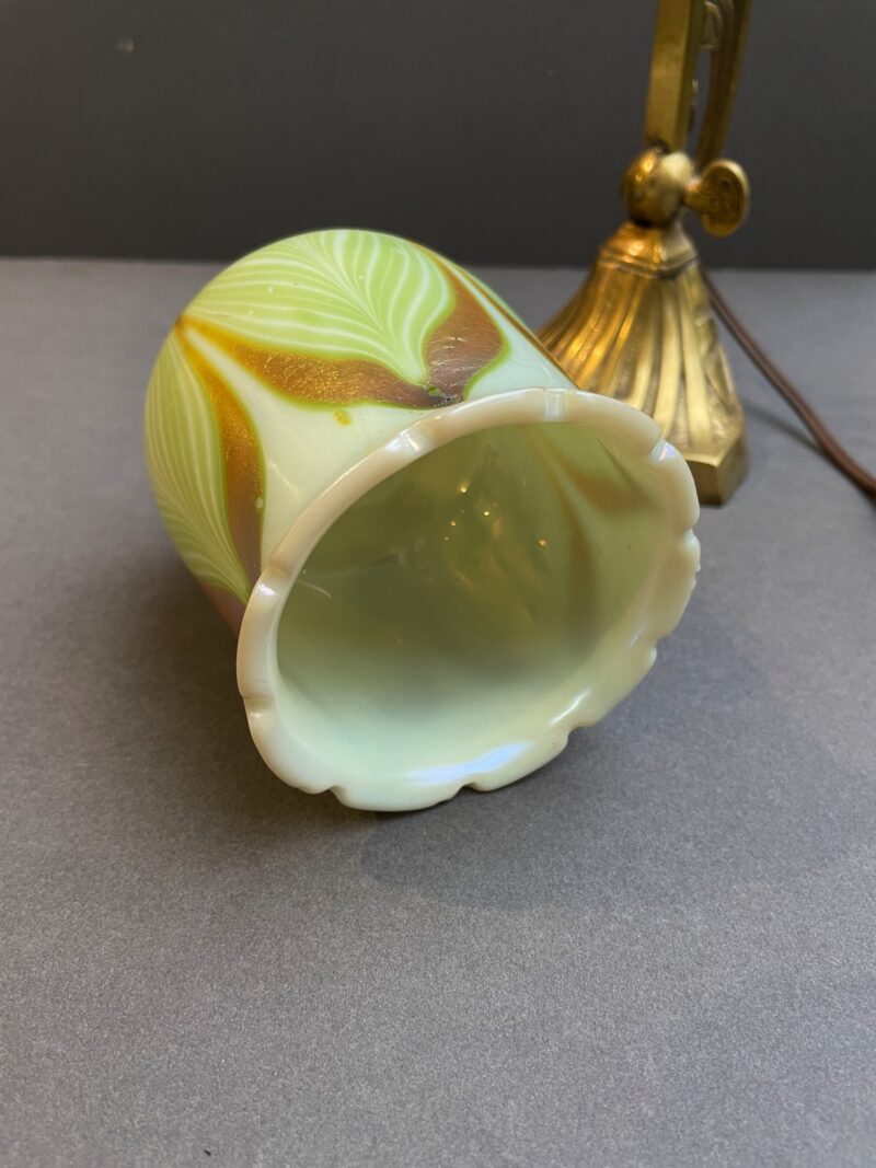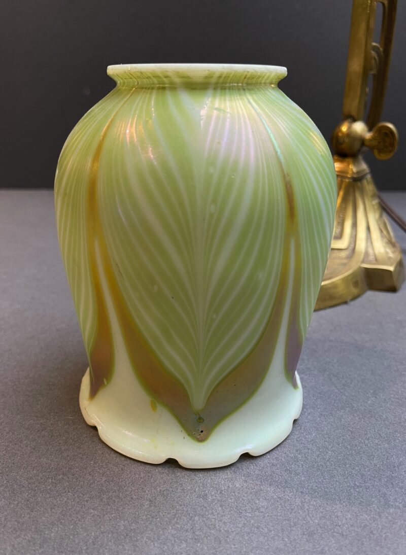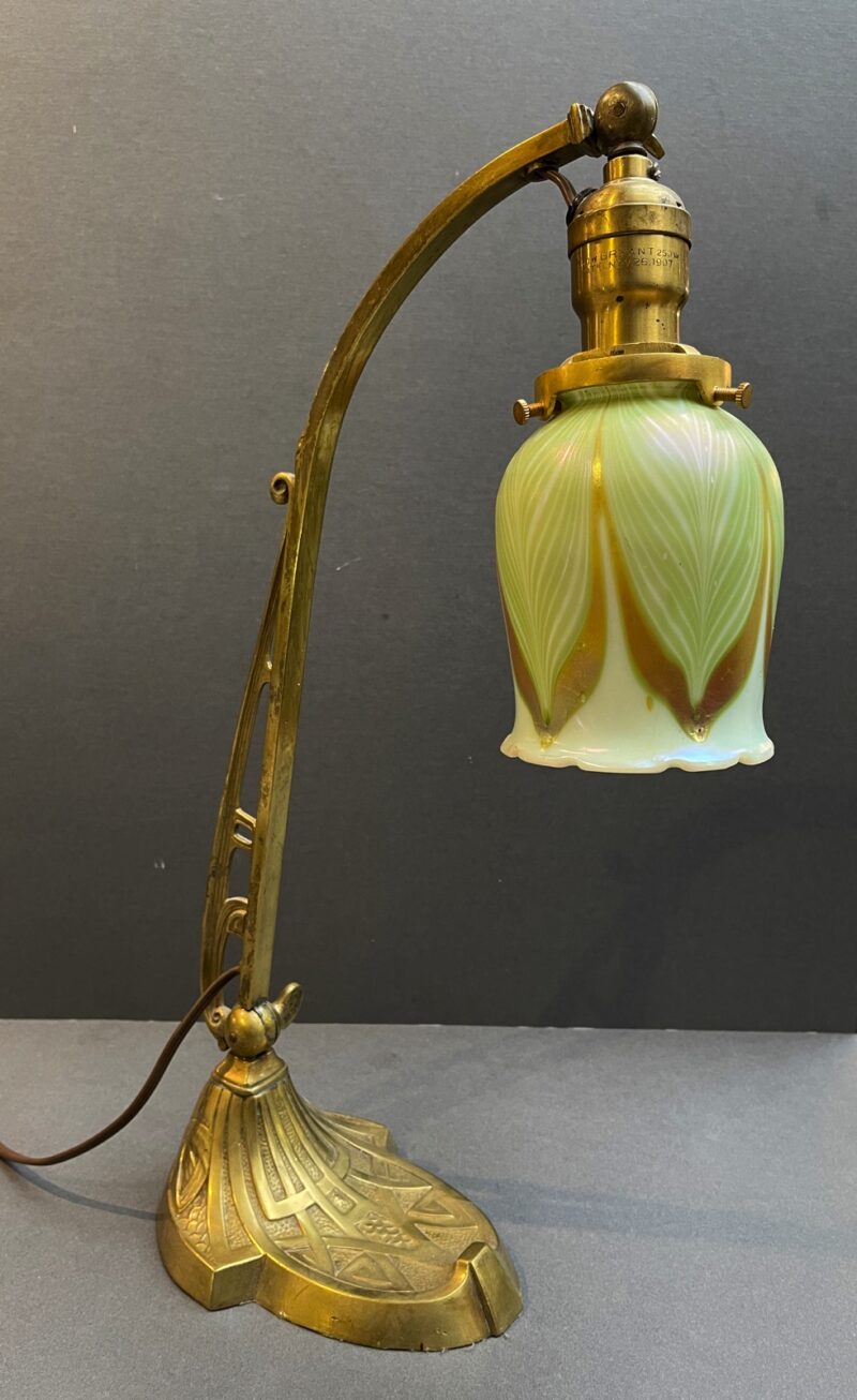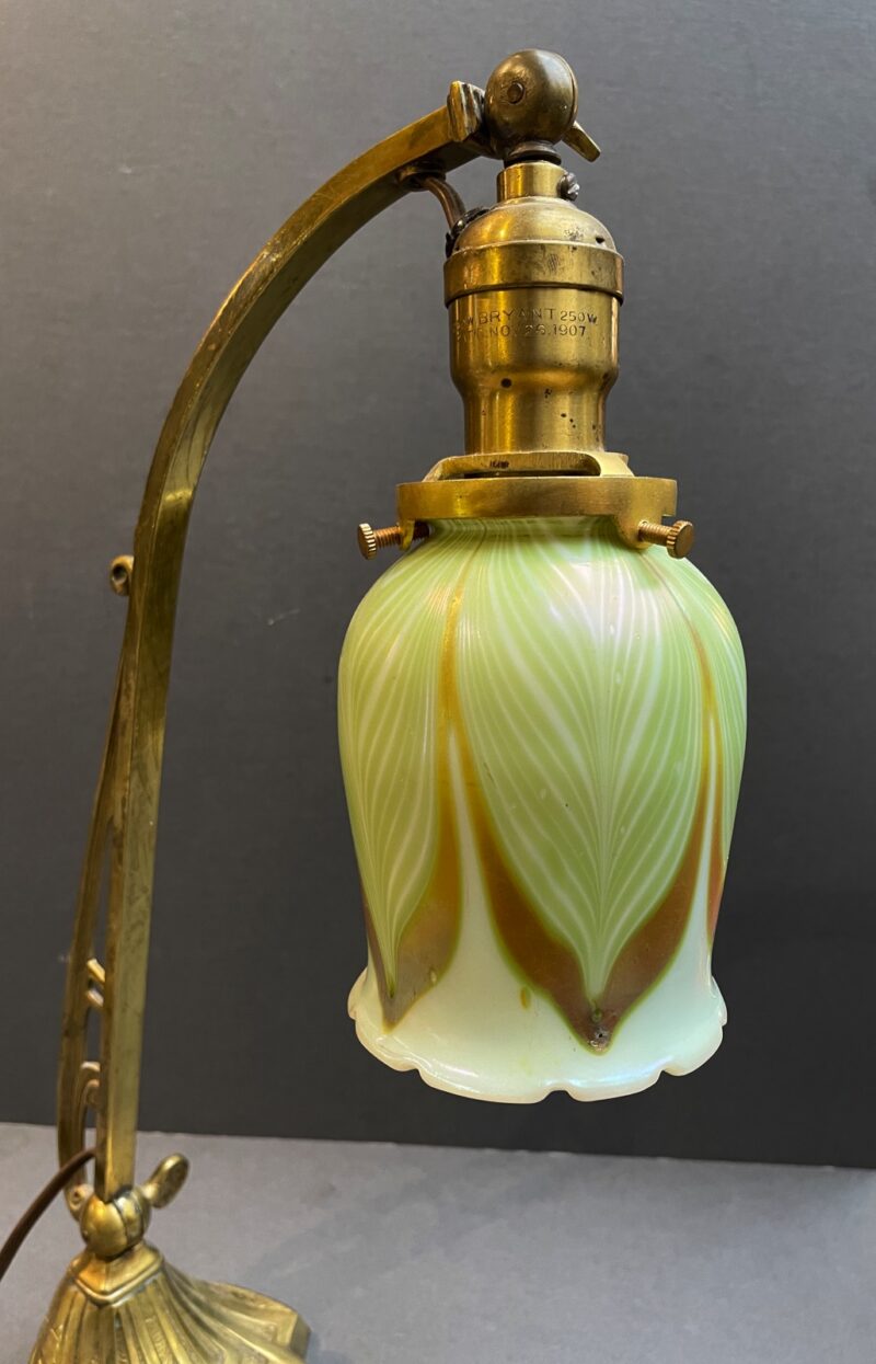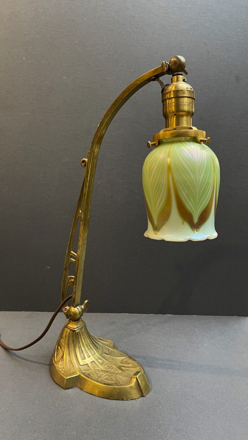v** SOLD ARCHIVES **vA wonderful curved frame bronze desk lamp, c. 1900, with classic Art Nouveau designs on the frame and a Loetz Austrian art glass shade in feathered patterns of green and gold on a white background. The shade has a scalloped rim and is 5 inches long X 3 inches wide.