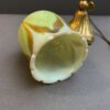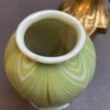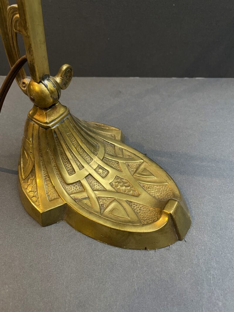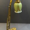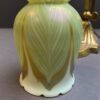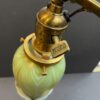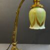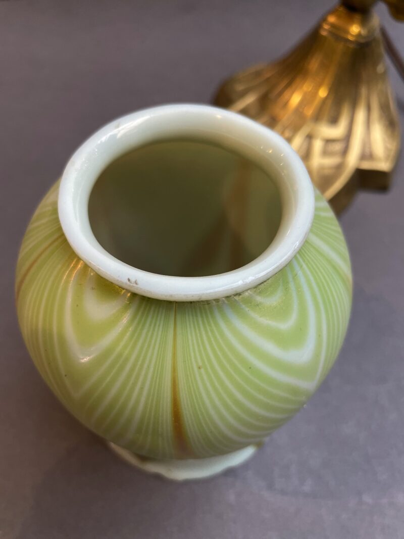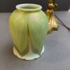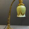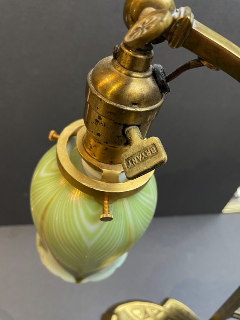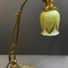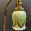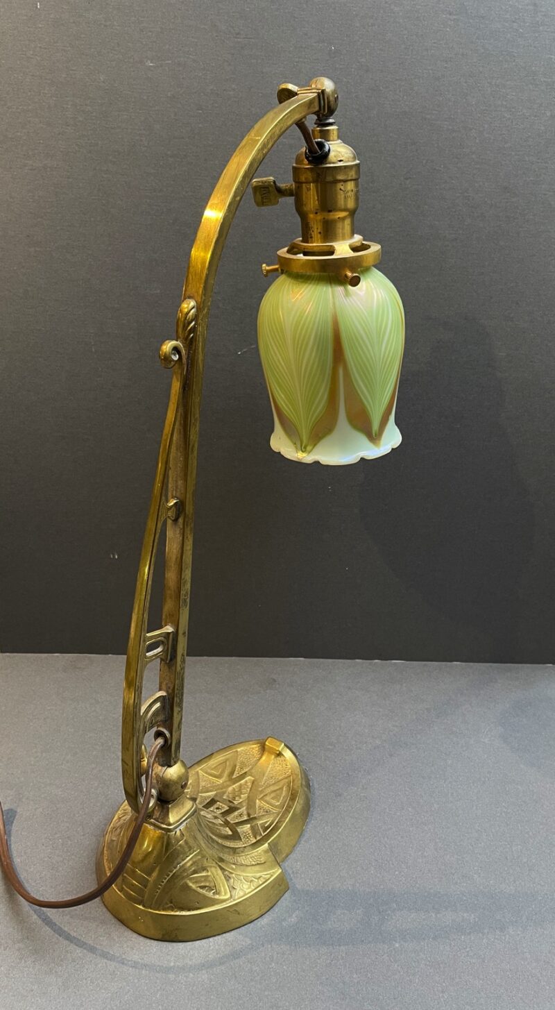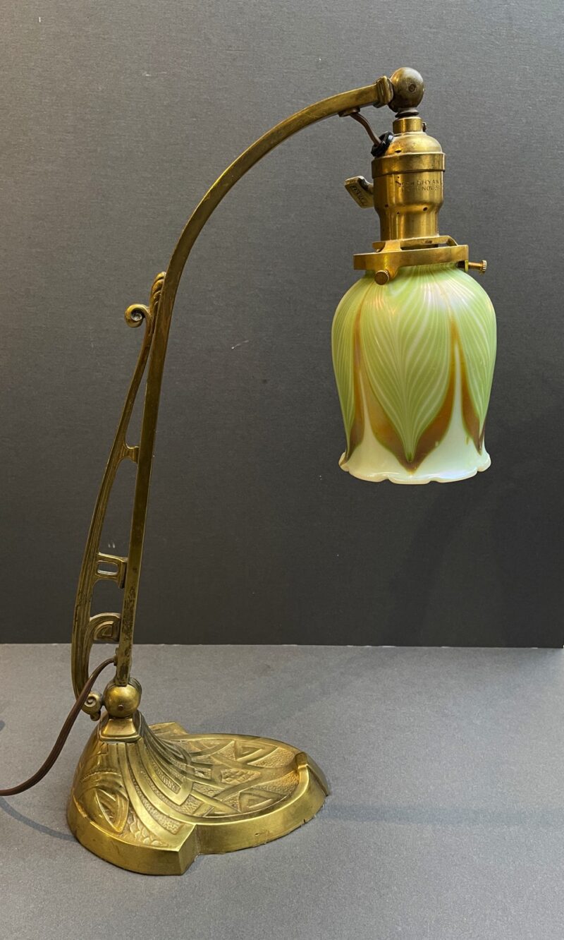 v** SOLD ARCHIVES **vA wonderful curved frame bronze desk lamp, c. 1900, with classic Art Nouveau designs on the frame and a Loetz Austrian art glass shade in feathered patterns of green and gold on a white background. The shade has a scalloped rim and is 5 inches long X 3 inches wide.