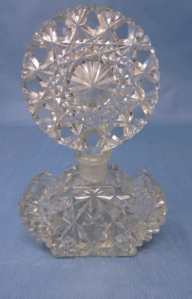 A gorgeous Czech clear glass perfume bottle with large round stopper. Both the bottle and stopper has an etched patterning the glass.