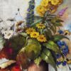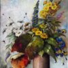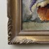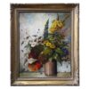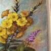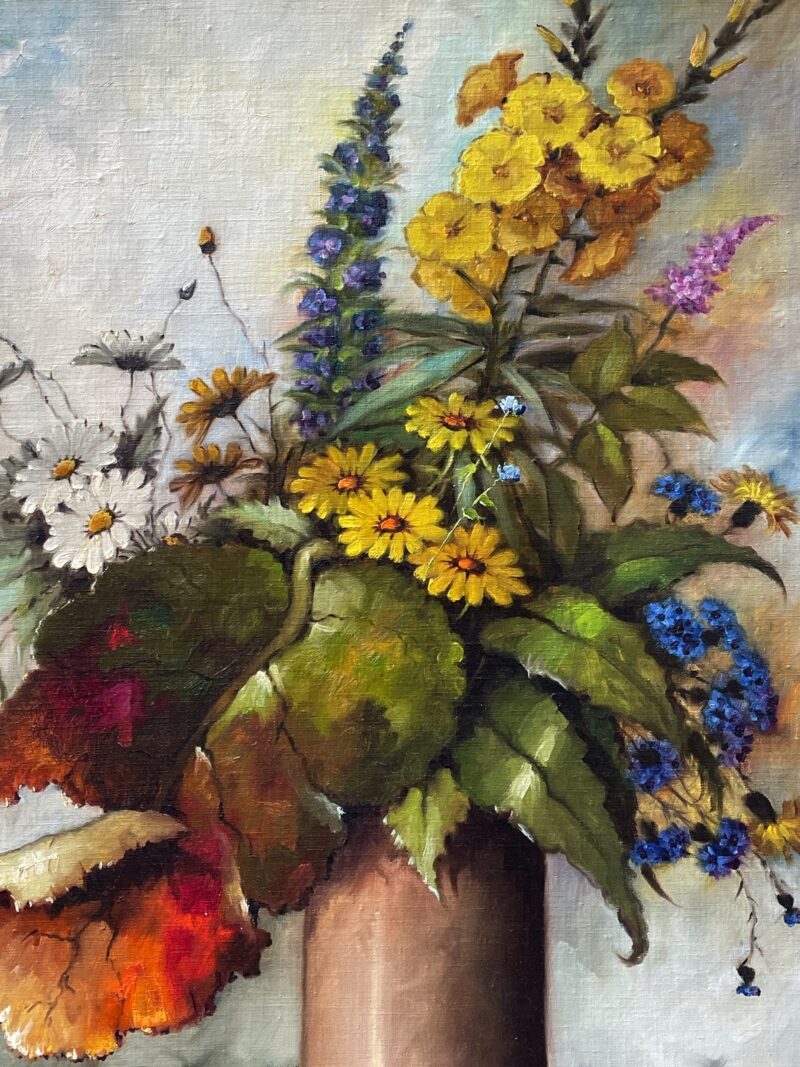 This is a beautiful still life oil painting on canvas that depicts a potted plant with an abundance of coloured flowers. It features some deep green leaves, and some vibrant red and orange leaves for some lovely contrast.