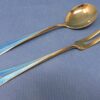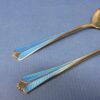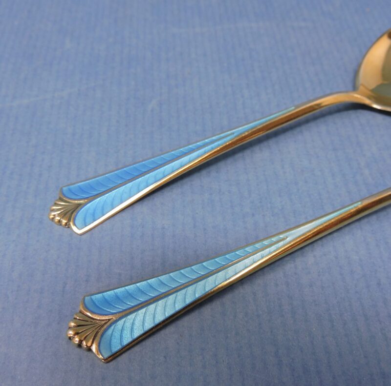 A wonderful pair of David Anderson Norway gold wash sterling silver and blue enamel serving pieces (small sauce spoon and lemon fork).