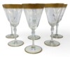 Each goblet is formed with a gently flared bowl supported by a slender stem and circular foot, the proportions lending both balance and grace to the form. The upper register is adorned with a richly burnished gold-encrusted band, finely detailed with an intricate scrolling rose and foliate motif. A narrow gilt line encircles the foot, completing the composition and reflecting the high level of decorative finish characteristic of Tiffin’s better quality lines of the period.