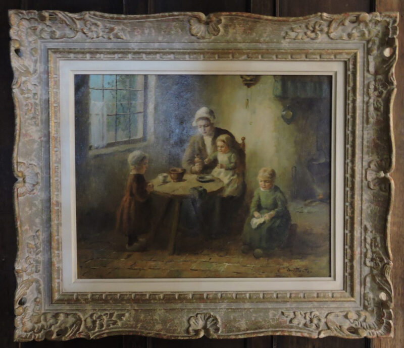 A lovely oil painting on canvas by the Dutch artist, Cornelius Bouter (1888-1966). The painting shows an interior kitchen scene with a woman and her three children.