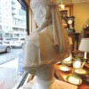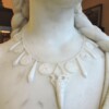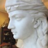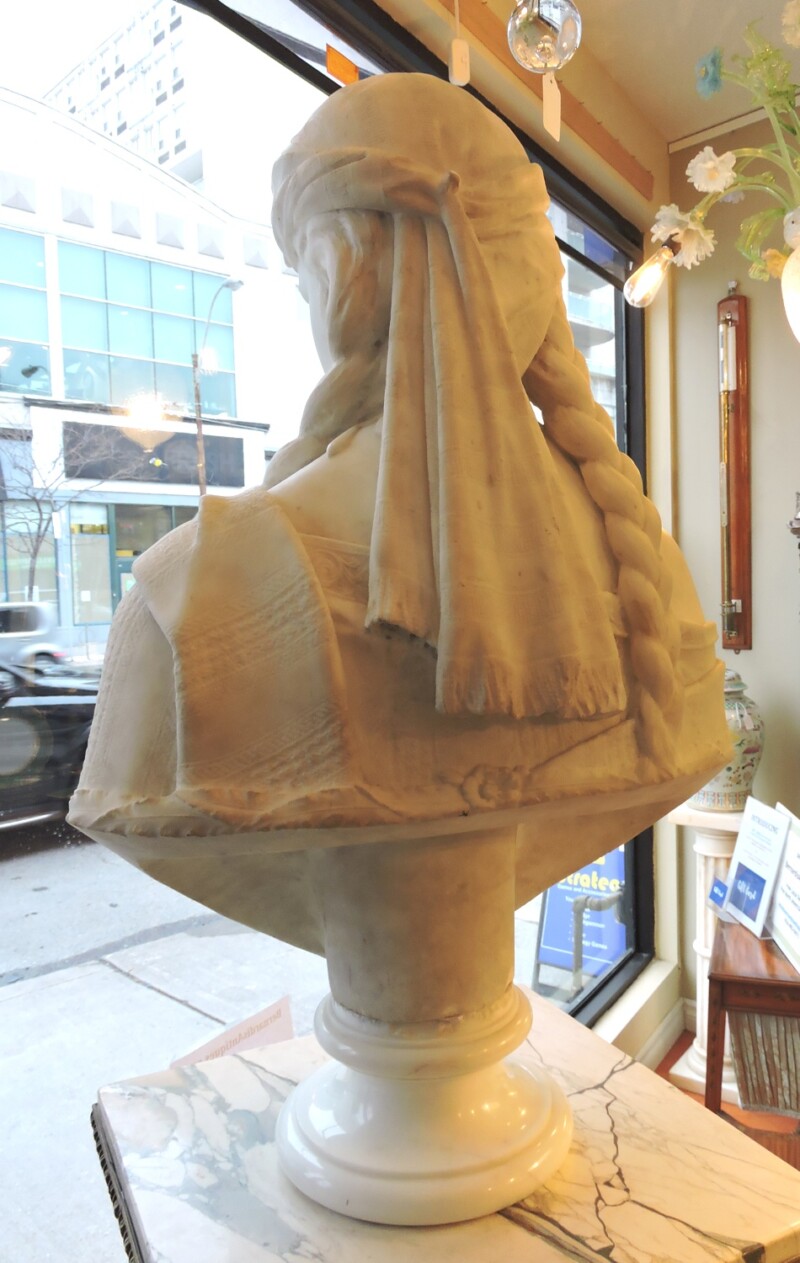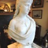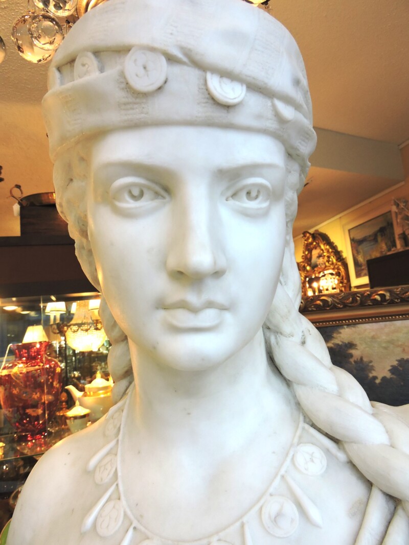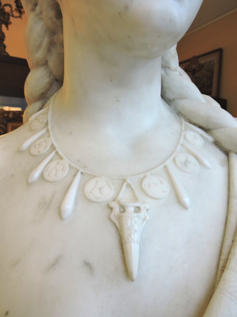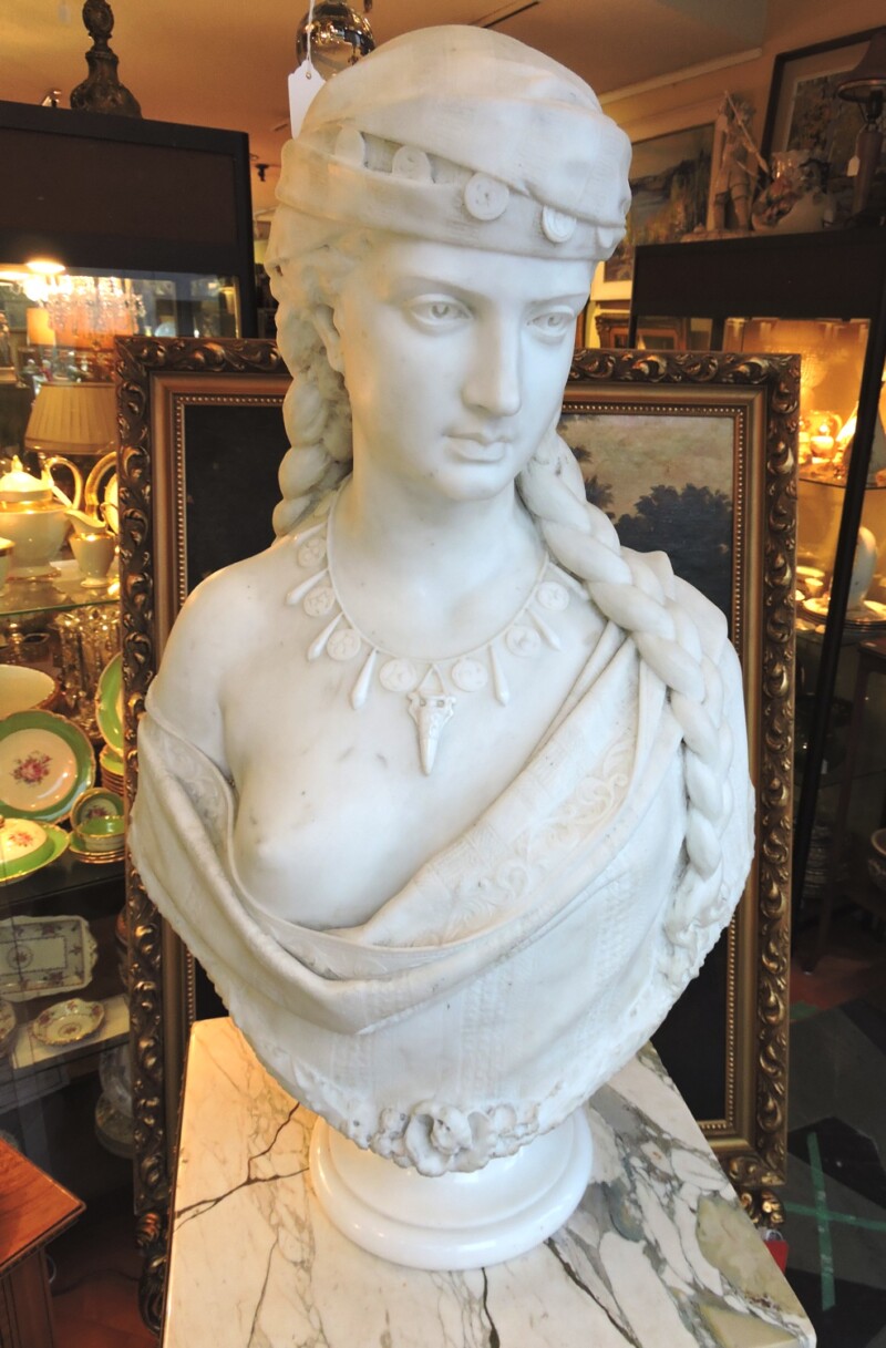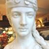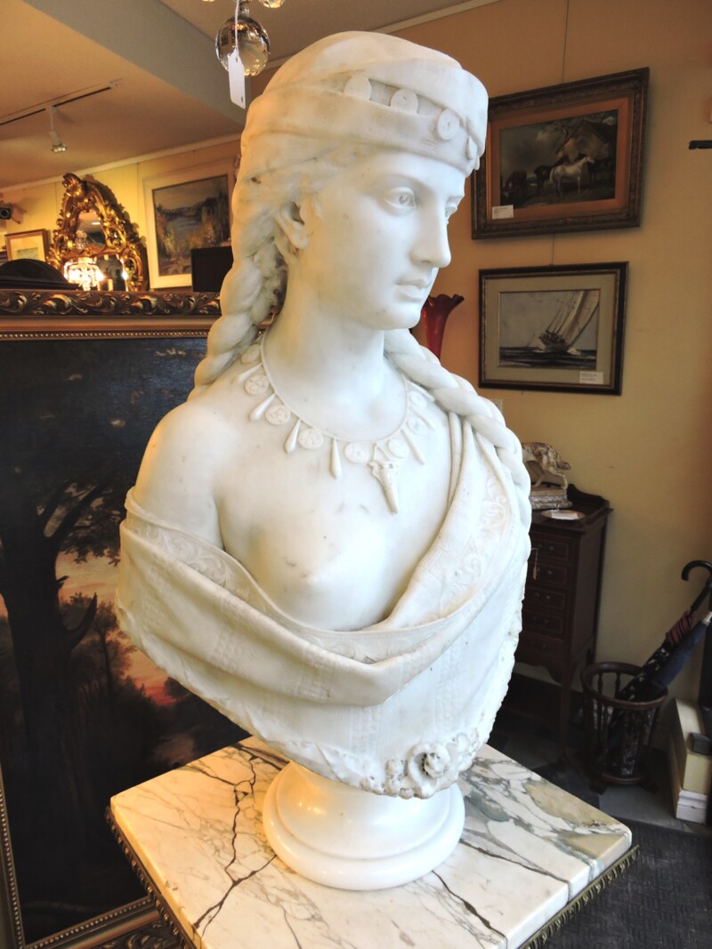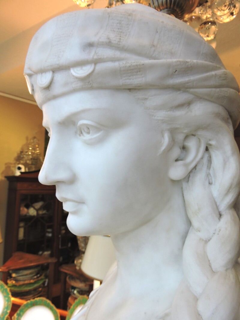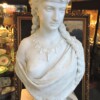 v** SOLD ARCHIVES **vA life size carved marble bust of a woman with braided long hair in two long tails, a carved necklace and headband. Her dress is loose and has slipped down beneath one breast. The hand carved marble bust dates early 19th century – most likely French.