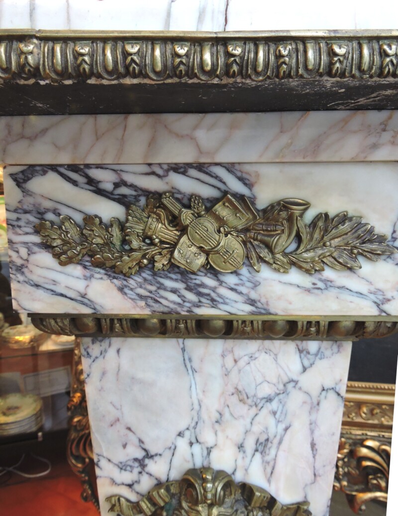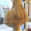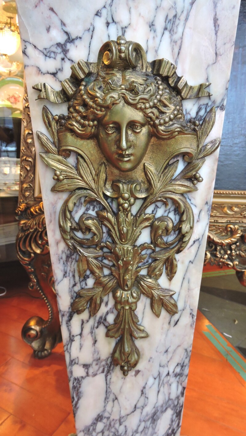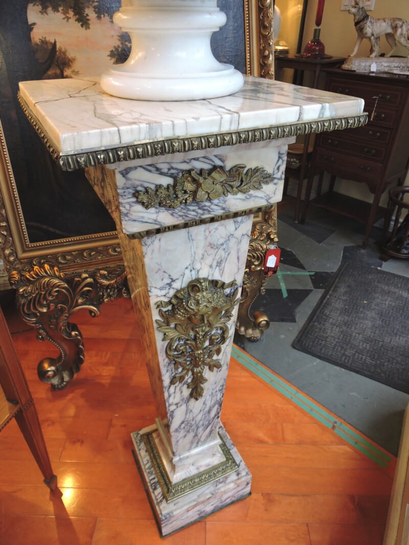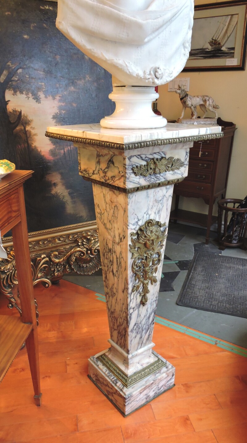 The large pedestal that she sits upon is also included. The carved marble pedestal is a tapered square shape with bronze applications.