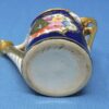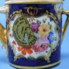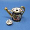 The watering can has a white background with cobalt blue and floral decoration and accented with gold on the spout, rim and around the body of the piece.