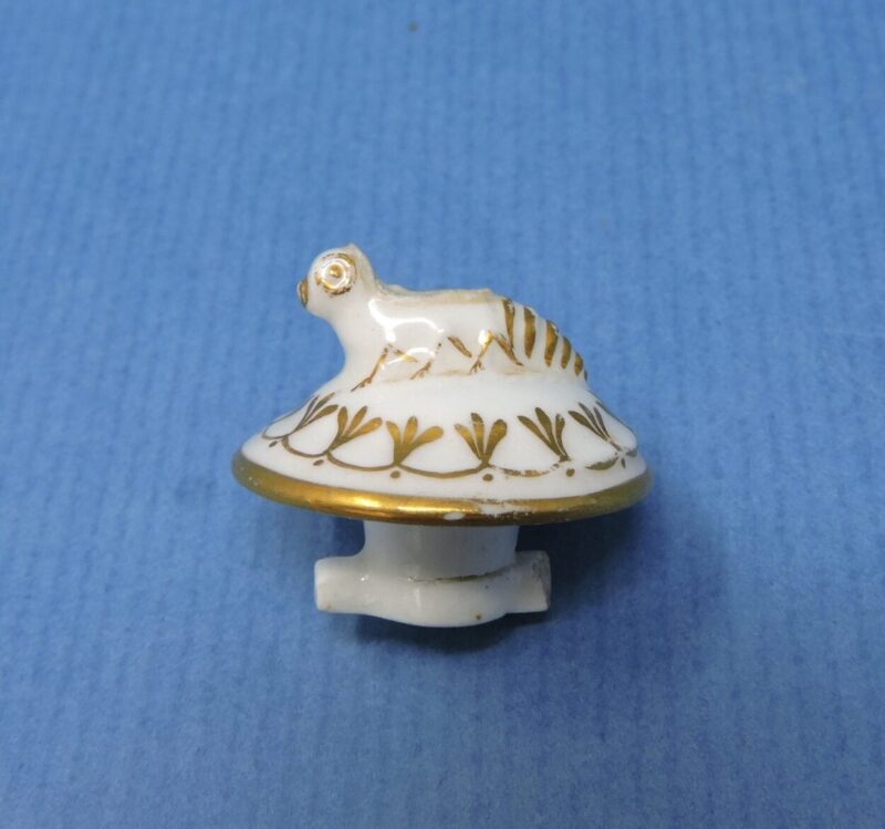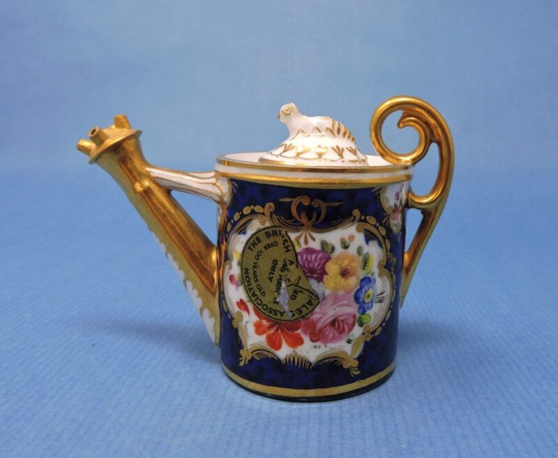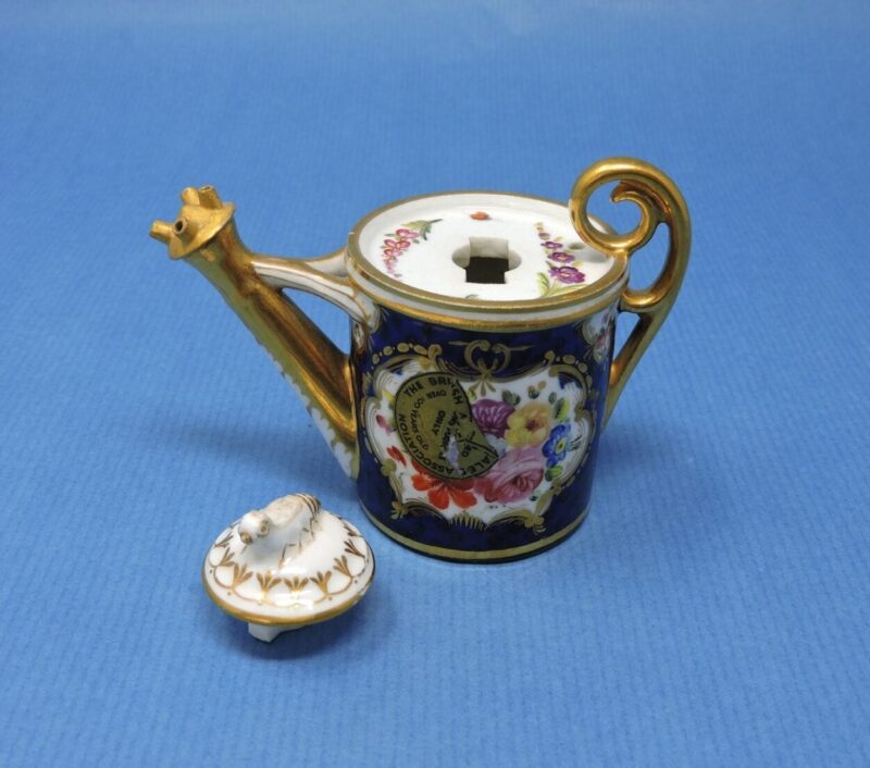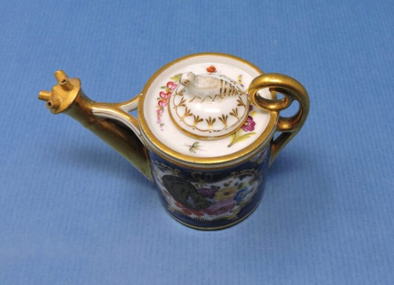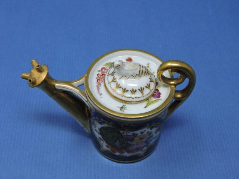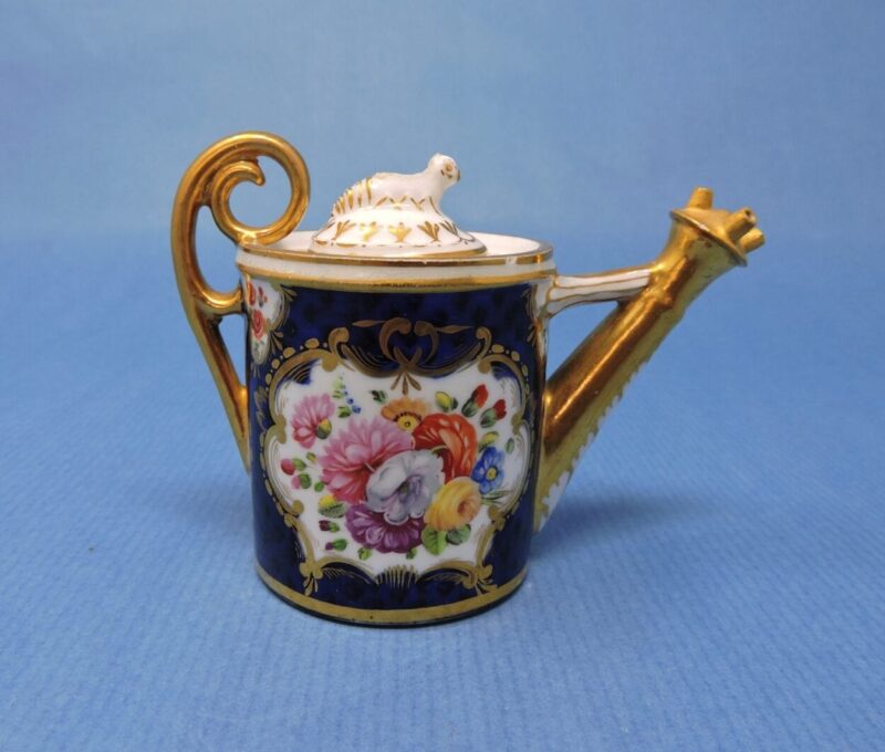 PorcelainsA miniature porcelain watering can with a sheep finial on the lid and 4 holes on the spout, dating from the early 19th century.