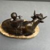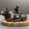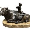 A fanciful bronze figurine of a boy playing a flute while sitting on the back of a reclining ox. The bronze is mounted on an attached marble base.  The scene may be of a famous story as I’ve found several versions of a boy playing flute on the back of a bull or oxen.