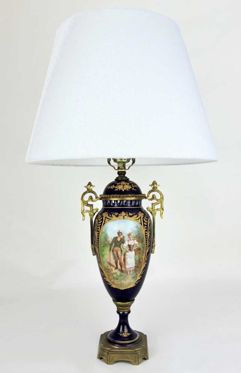 v** SOLD ARCHIVES **vA beautiful Sevres style table lamp, it dates early 20th century, possibly around circa 1920’s, France. It features a intricate porcelain body, ornate gilt metal handles and mounted base, and a lovely transfer and hand painted figural scene in the front centre, decorated with embellishments of gold leaf and scroll throughout.
