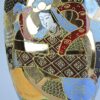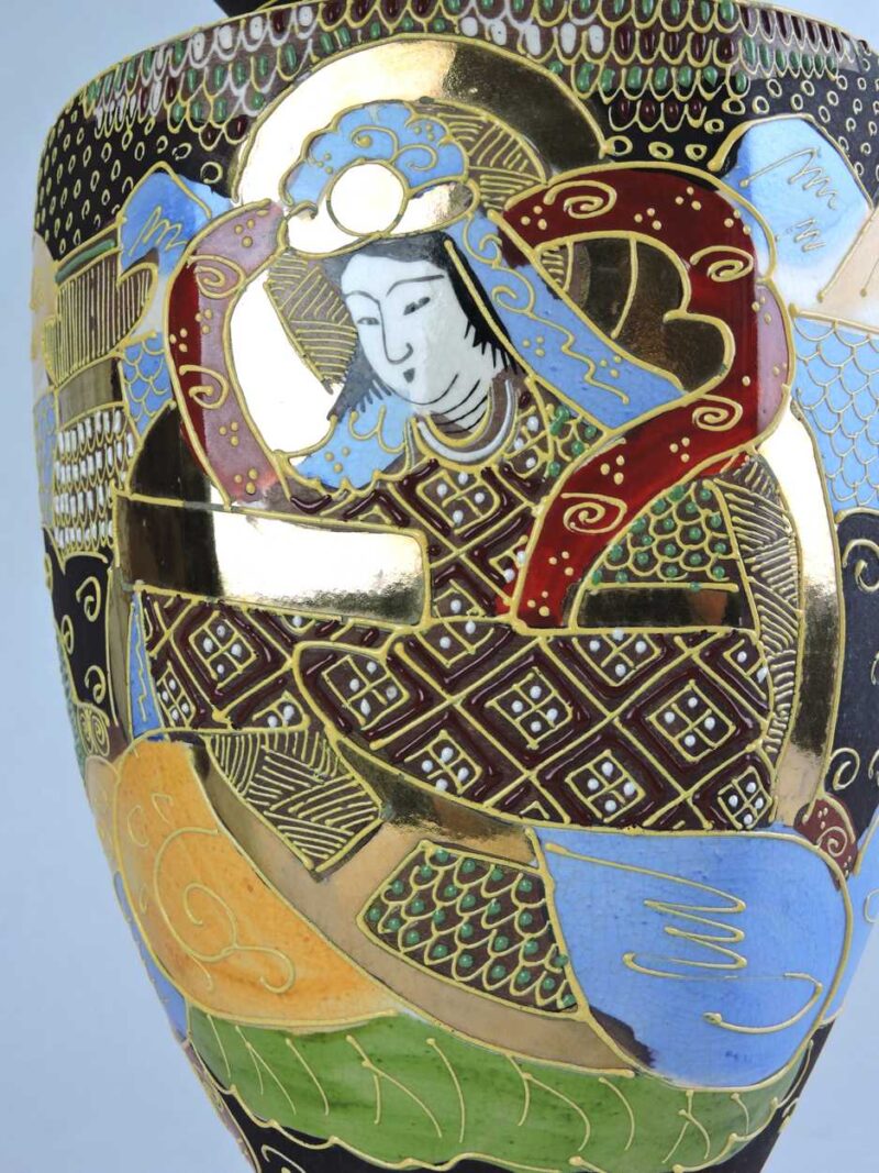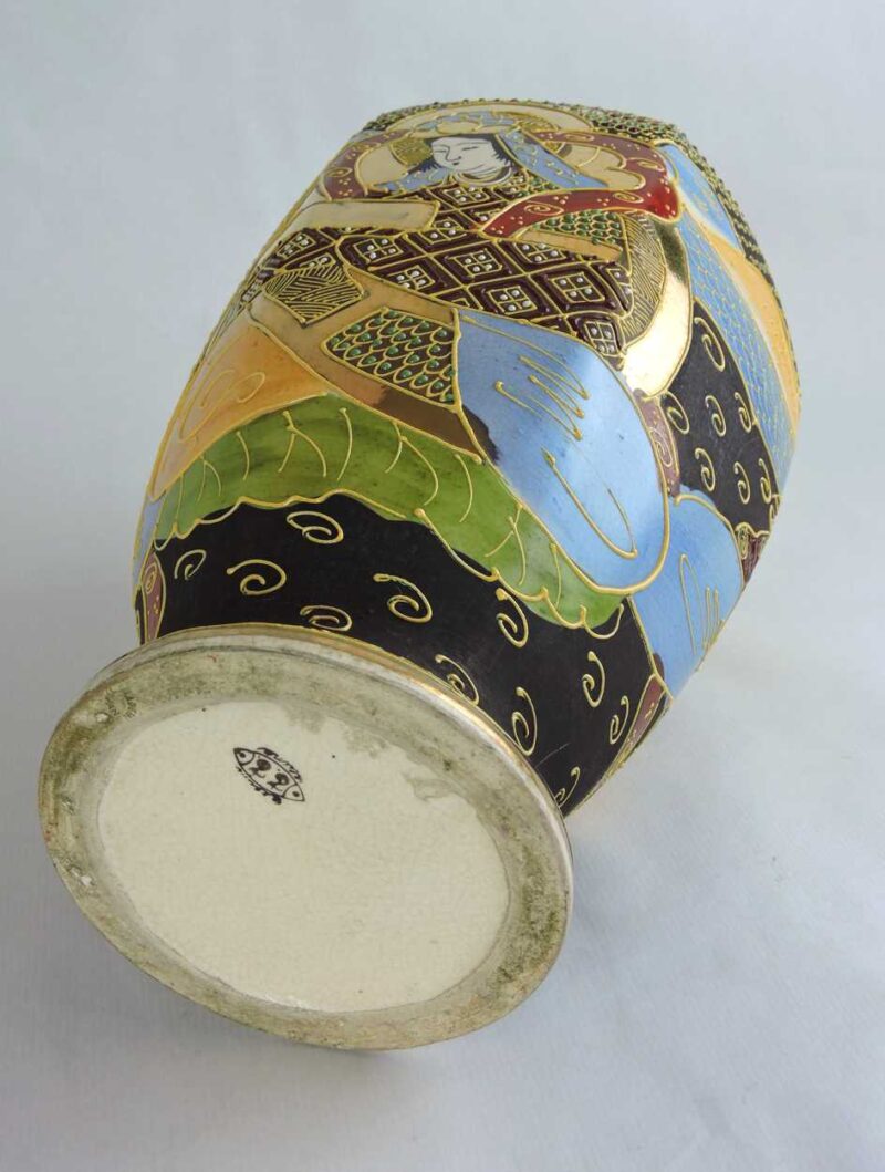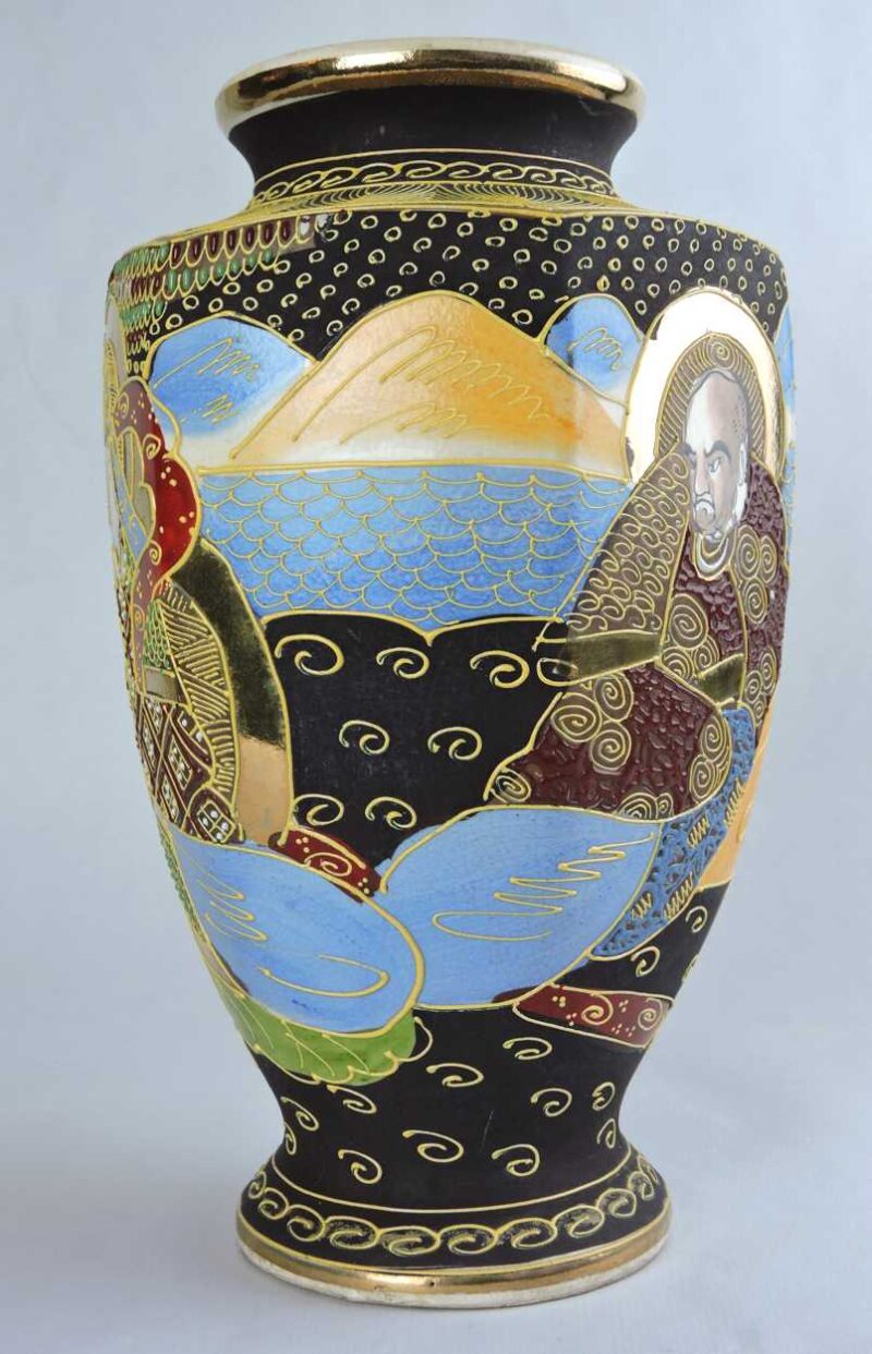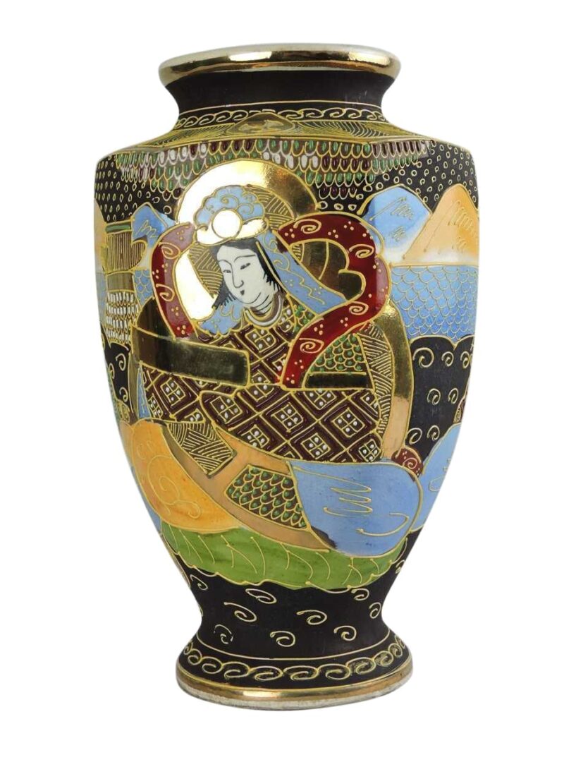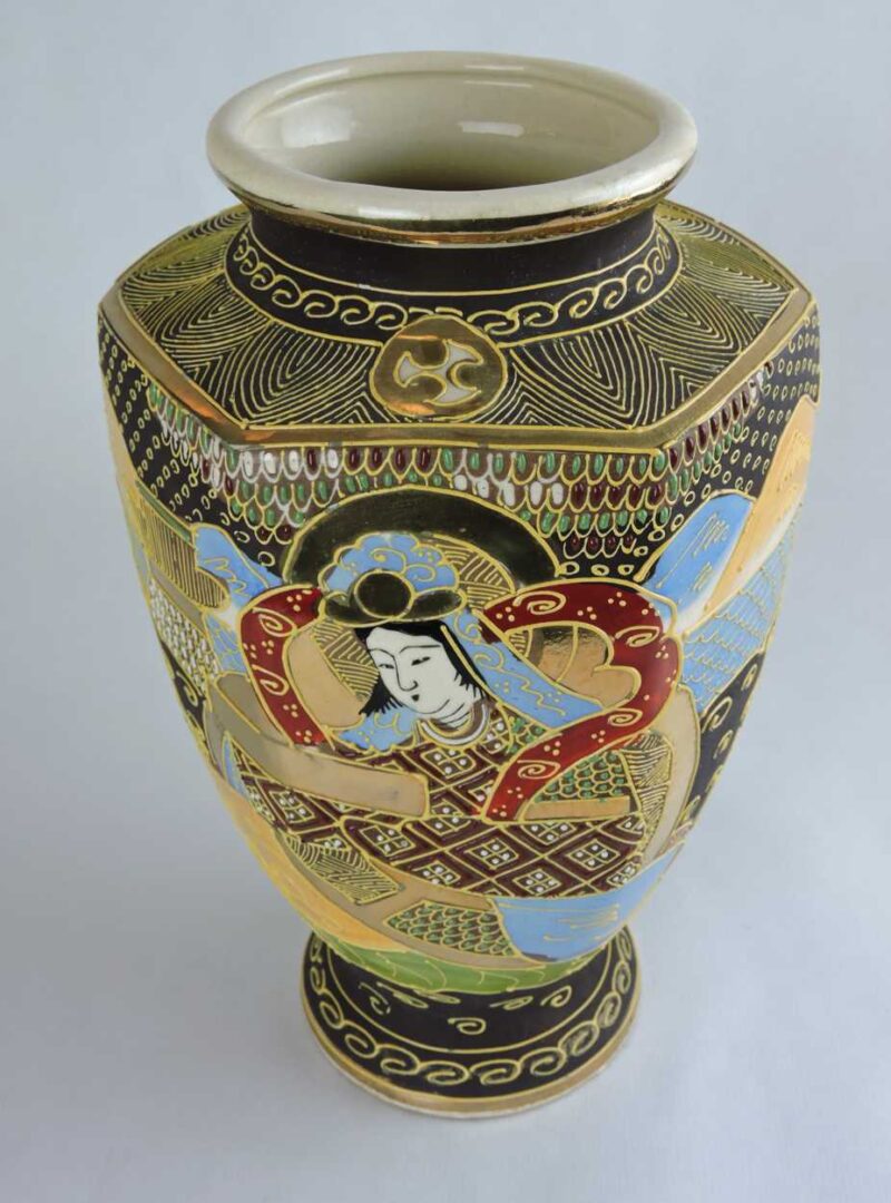 v** SOLD ARCHIVES **vA stunning hexagonal shaped vase with hand-painted scenes of Japanese figures by Satsuma Pottery Ware in Japan, it dates early 20th century. It features a delightful animated folklore scene of three finely dressed Japanese figures in the mountains, it is decorated with embellishments of line, floral, swirls and geometric shapes. Beautifully designed and hand-painted in colours of green, red, orange, red, and brown with accents of gold throughout. Perfect for a unique gift, collectors or decorating the home.