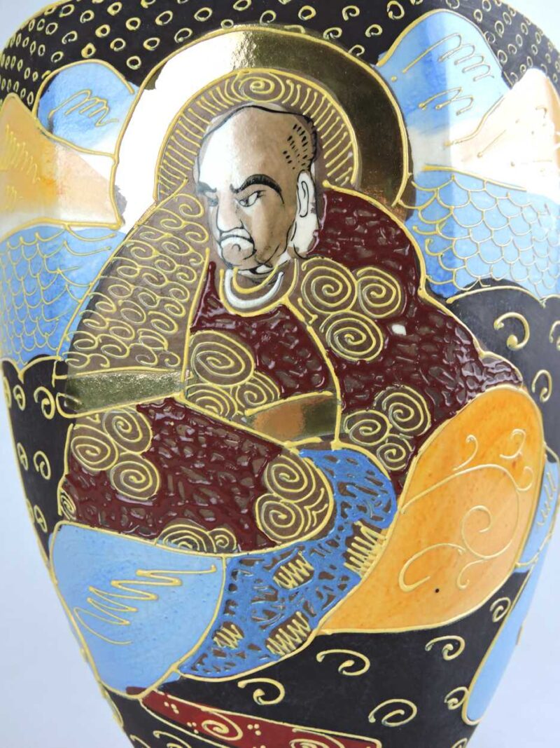 Early 20th Century Hand-Painted Satsuma Hexagonal Vase With Japanese Folklore Scene
