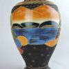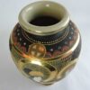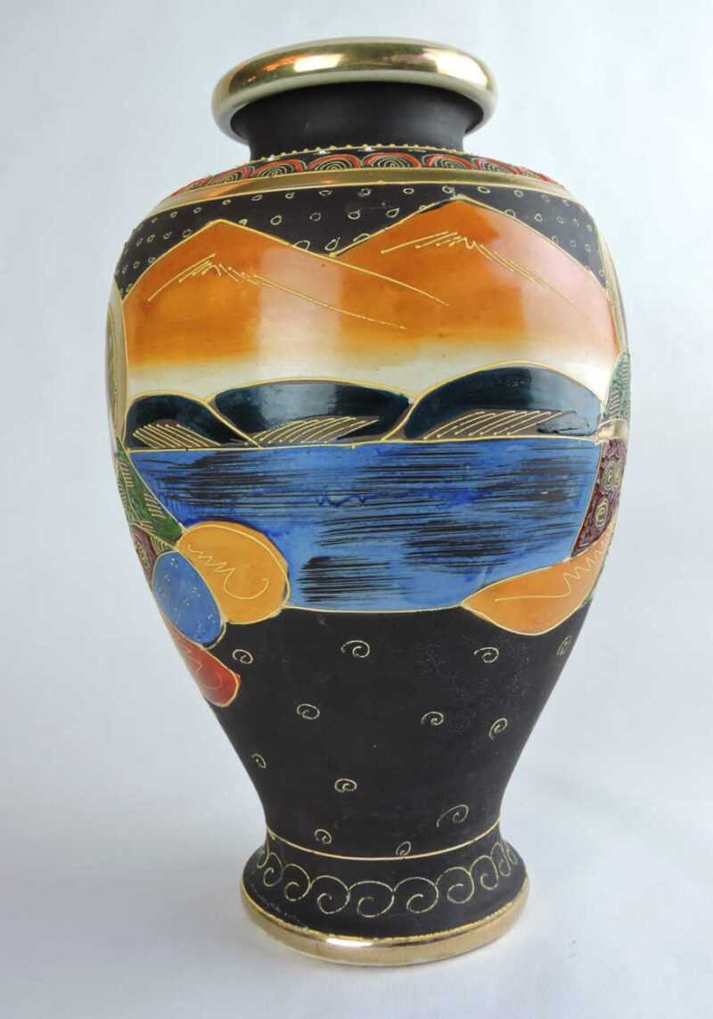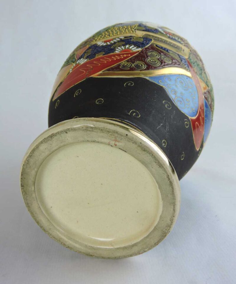 v** SOLD ARCHIVES **vA lovely ovoid shaped vase with hand-painted scenes of Japanese figures by Satsuma Pottery Ware in Japan, it dates early 20th century. It features a delightful animated Japanese figural scene of a three wise elders in fine line work, it is decorated with embellishments of floral, ribbon and geometric shapes. It is beautifully designed and hand-painted in colours of green, red, orange, red, and brown with accents of gold throughout. Perfect for a unique gift, collectors or decorating the home.