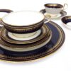 An exquisite early Aynsley china dinner set for 12 in a rich cobalt blue border overlaid with gold design over a white centre.