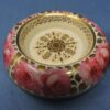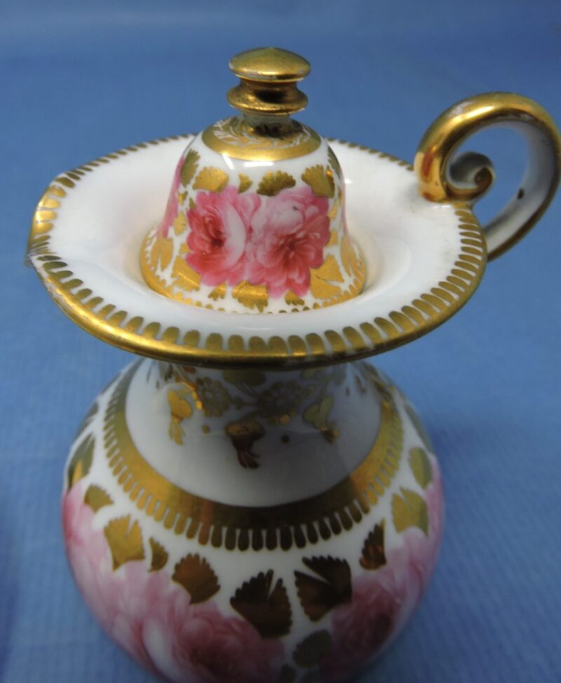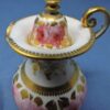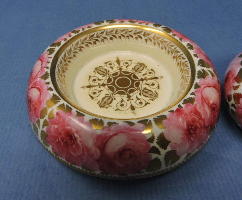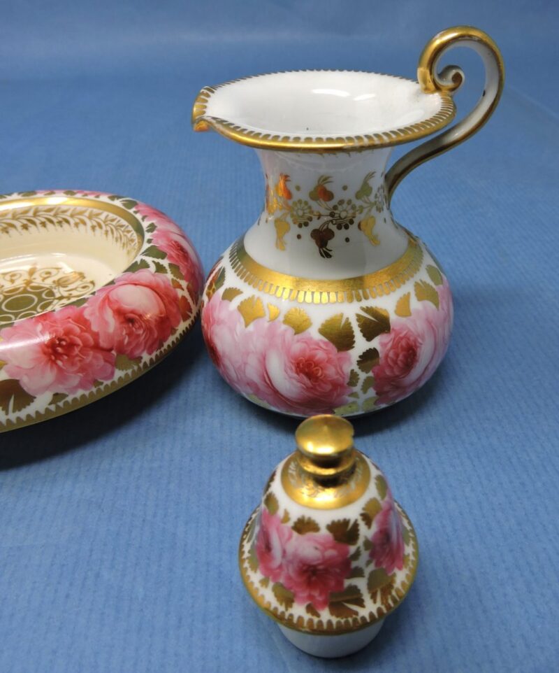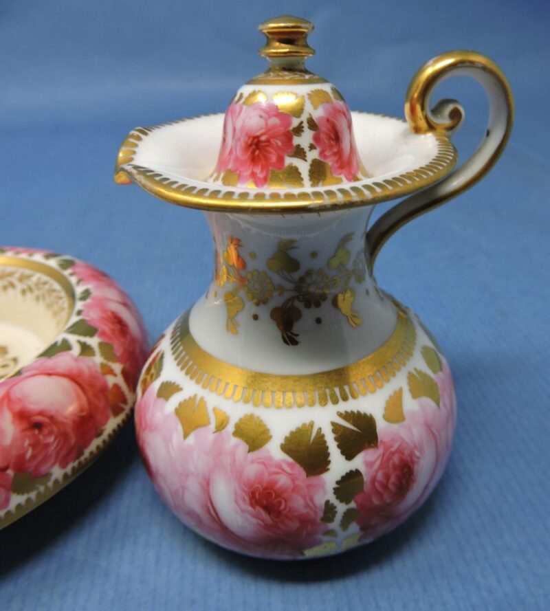 v** SOLD ARCHIVES **vA wonderful Davenport English bone china miniature lidded jug with matching under-bowl in the “Dav 18” pattern. The pieces have a white background with large pink cabbage roses and a gold medallion centre on the bowl. There is also gold trim on the body of each piece as well as on rims, lid and handle of the jug.