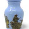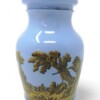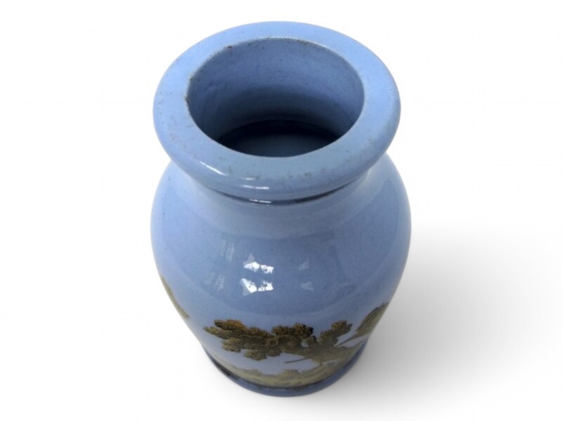 Here is a lovely early Pratt Ware small pottery paste jar with a blue background and painted scenes in gold of hunters with their dogs, chasing rabbits.