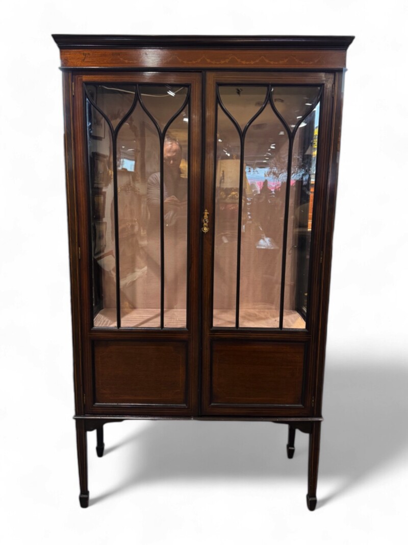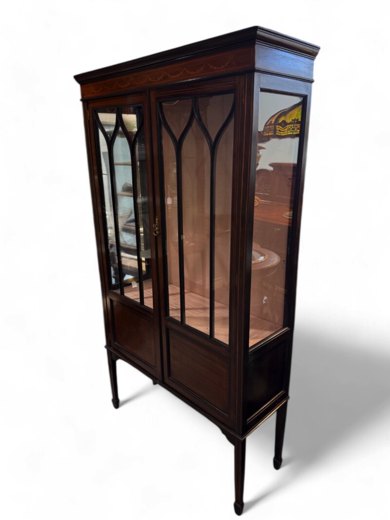 A simple, elegant Edwardian period display cabinet.  Inlaid with satin wood.  The cabinet features two doors that open to reveal two glass shelves.  Lighting has been added to the cabinet to show off whatever collection you decide to add in the cabinet.  Glass mullions are all individual panes.  The cabinet sits on 4 narrow legs with spade feet.  The Edwardian furniture takes its designs from the earlier Sheraton period of the 18th century.