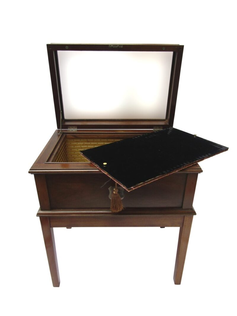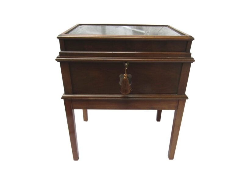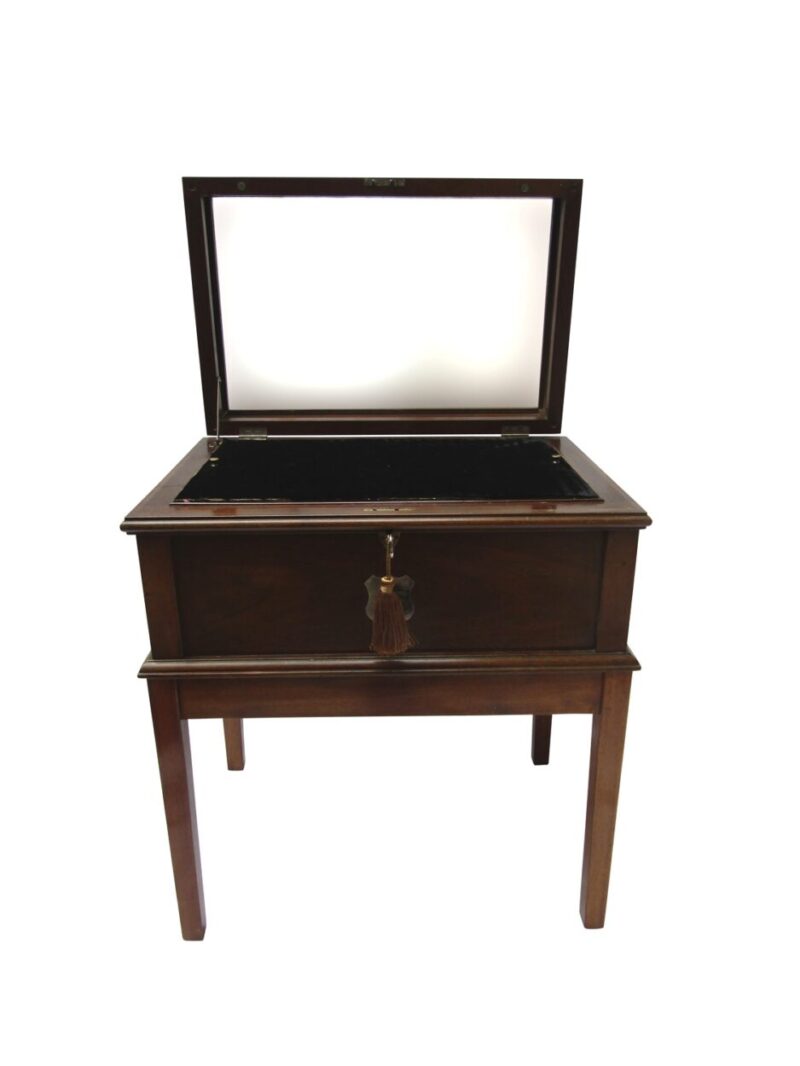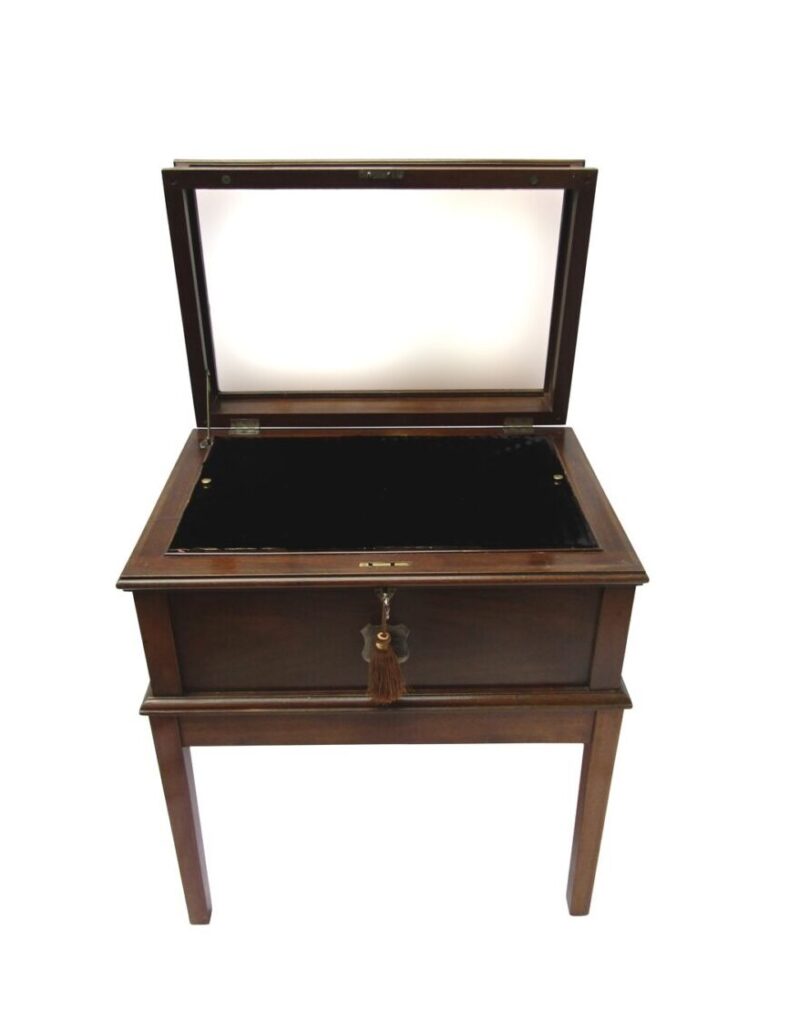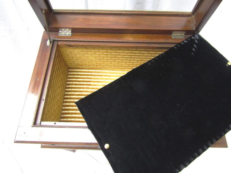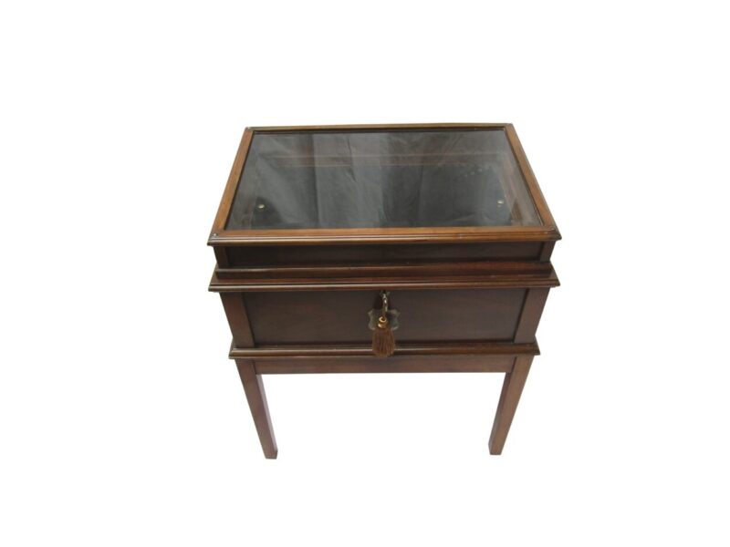Edwardian Mahogany Shadowbox Showcase Table with Hinged, Bevelled Glass Top – dated 1902