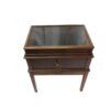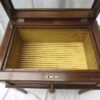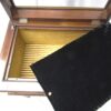 v** SOLD ARCHIVES **vAn Edwardian period mahogany showcase table with a hinged shadowbox lid and a bevelled glass top. The interior of the showcase has a flat black velvet tray with two knobs which is removable and reveals a deep storage which is lined with a ribbed yellow velvet yellow and fabric.