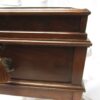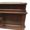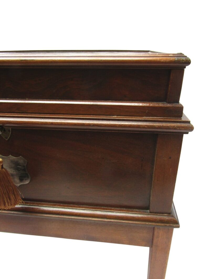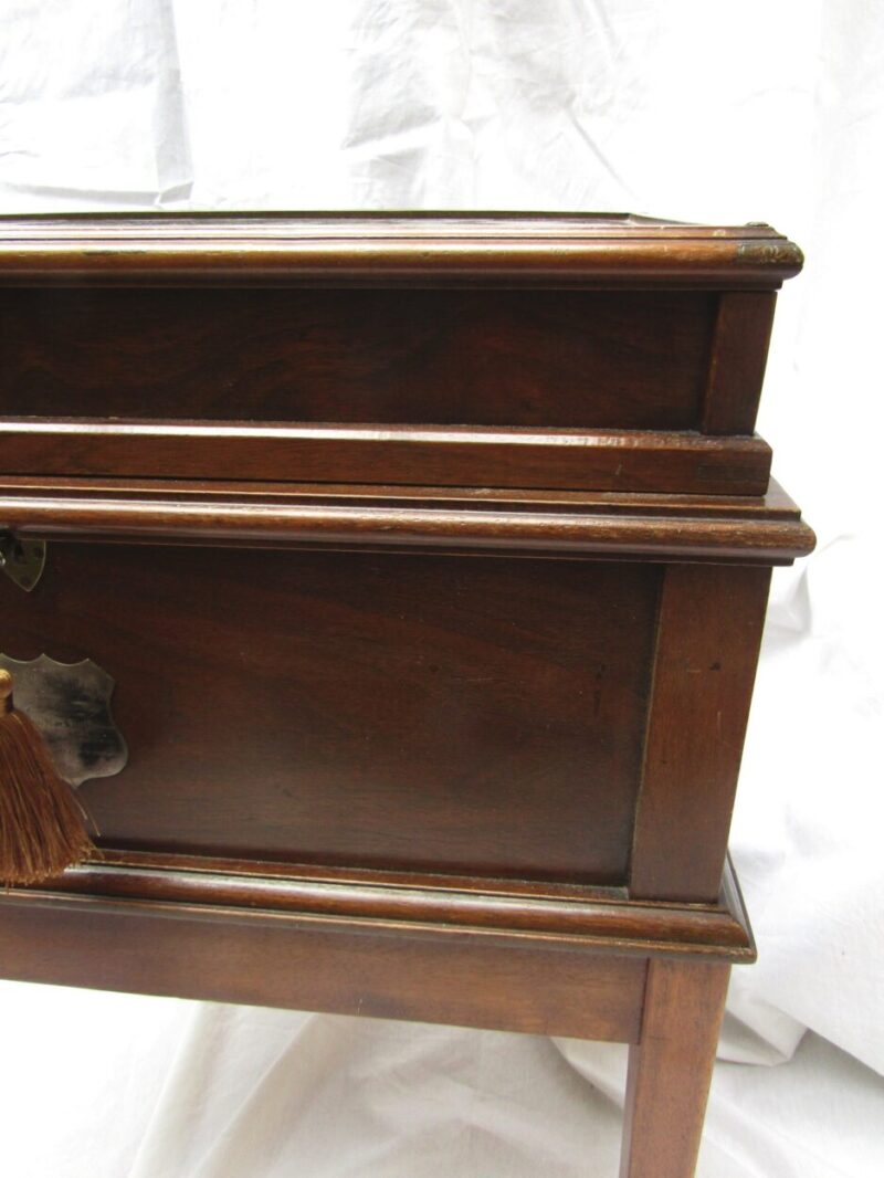 There is a key and lock on the front of the piece and a “faux” drawer with a metal handle on each side of the table. The table has 4 tapered straight legs.