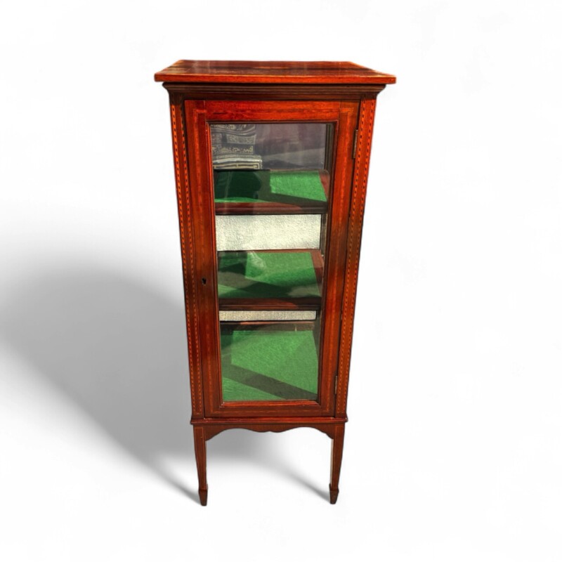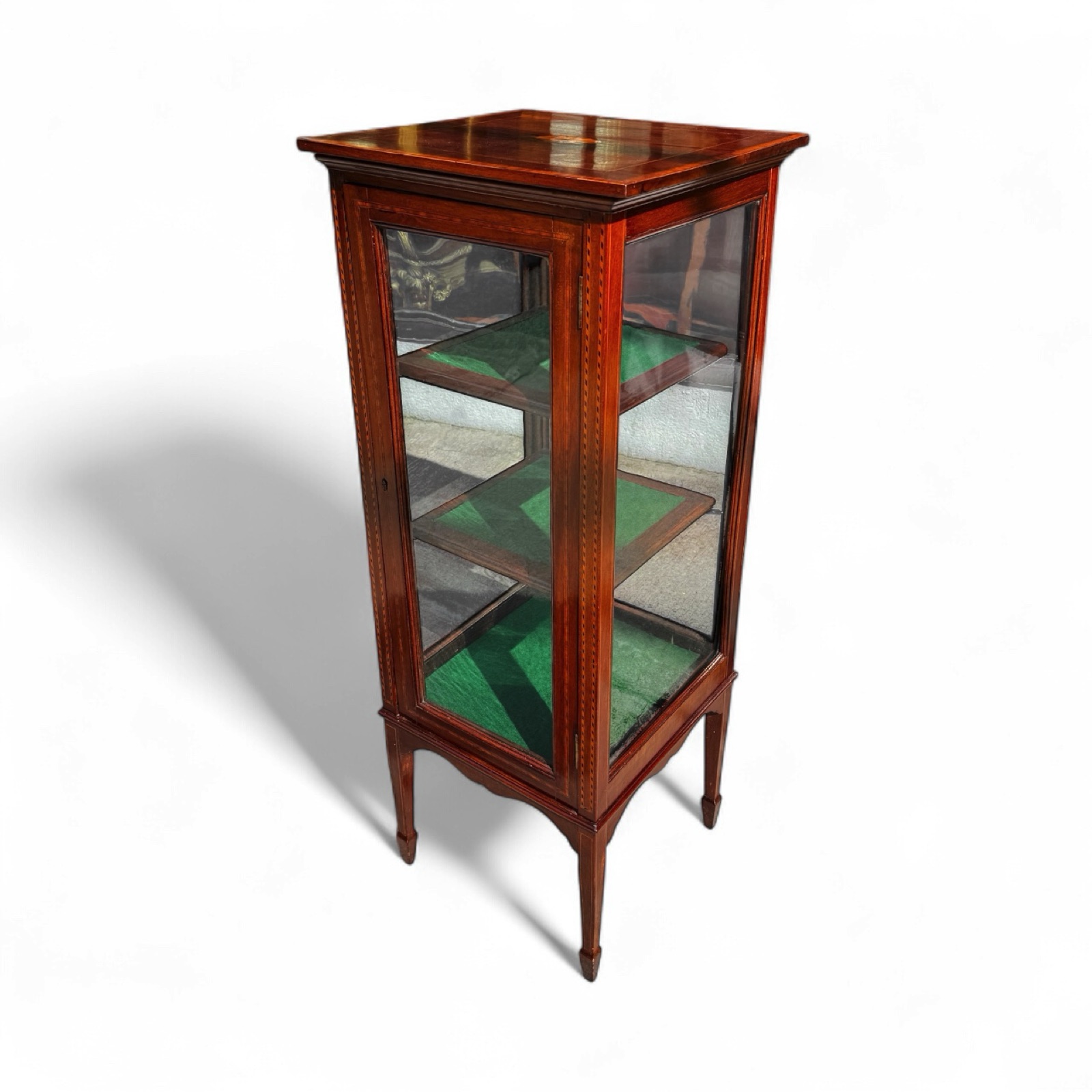 FurnitureAn attractive tall and square Edwardian mahogany curio display cabinet, circa 1890s. The antique glass display cabinet has a single glazed panelled door with a key, that opens to reveal a neat interior, consisting of three fabric lined shelves. A decorative inlaid satinwood front trim, with four square legs. Very neat and compact, in excellent condition.