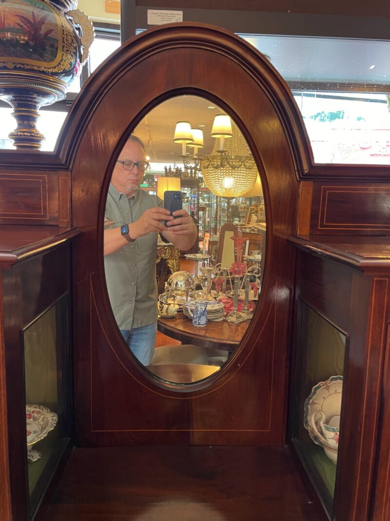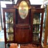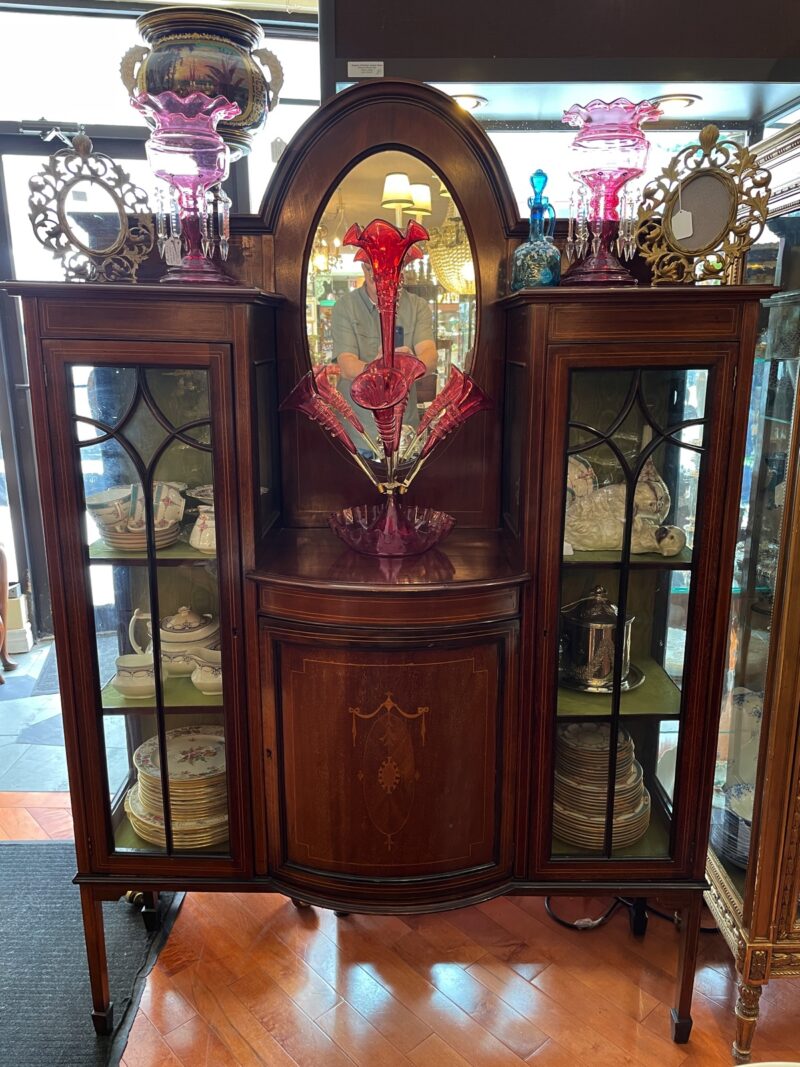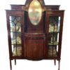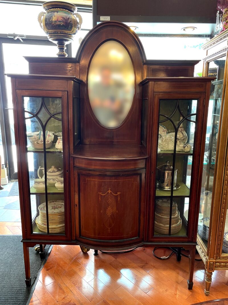 A lovely late 19th century Edwardian period mahogany vitrine.  Two display cabinets on each side flank a small centre  cupboard with shelf and oval mirror above.  The cabinet sits on 4 narrow spade foot legs.  The centre door is inlaid with a decorative satinwood design.