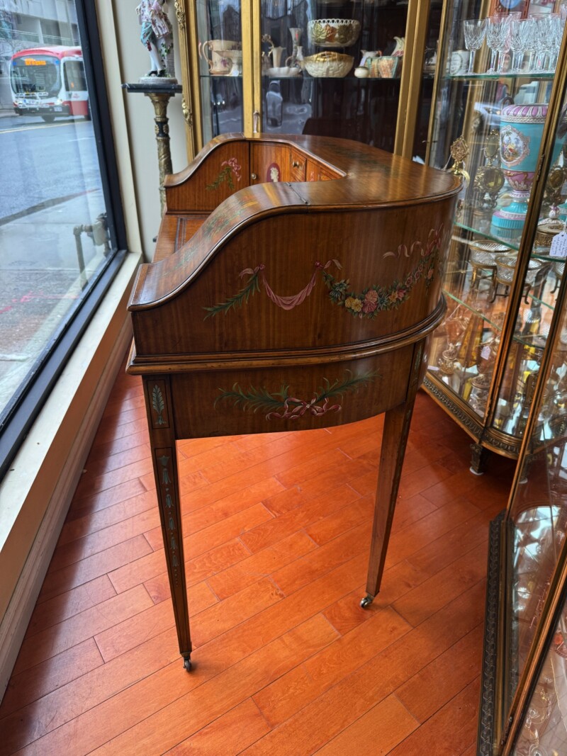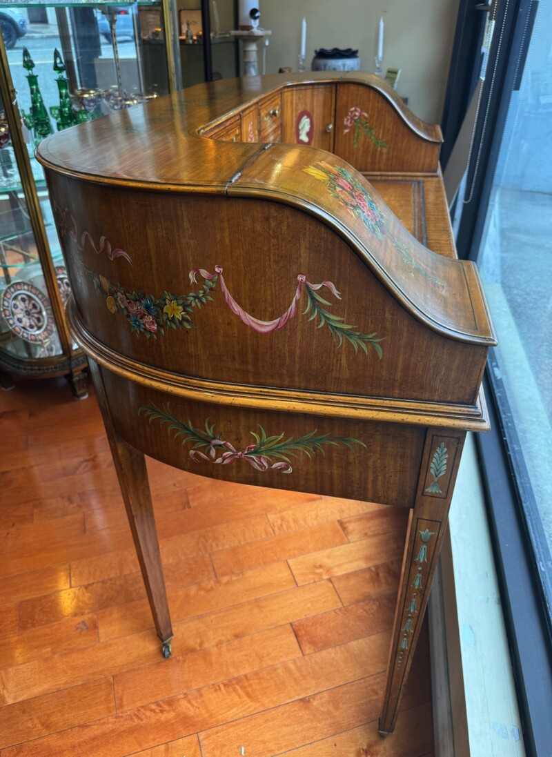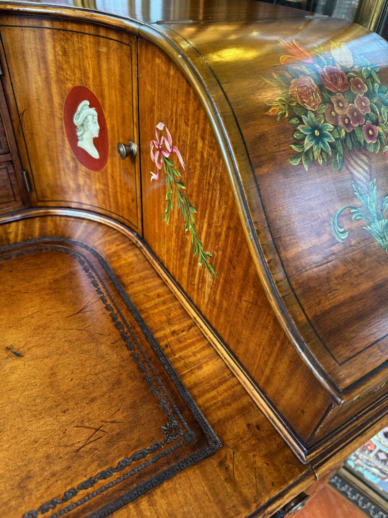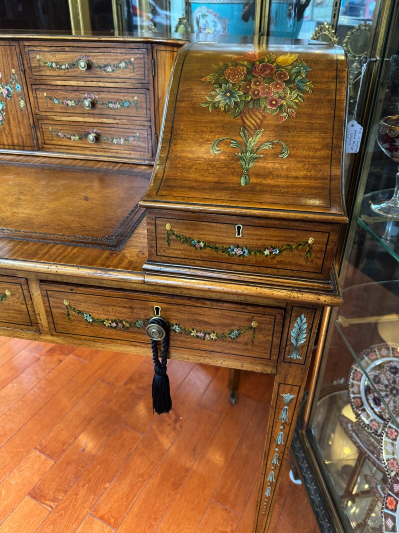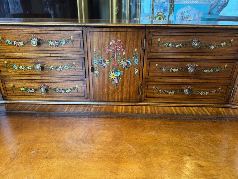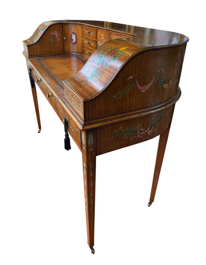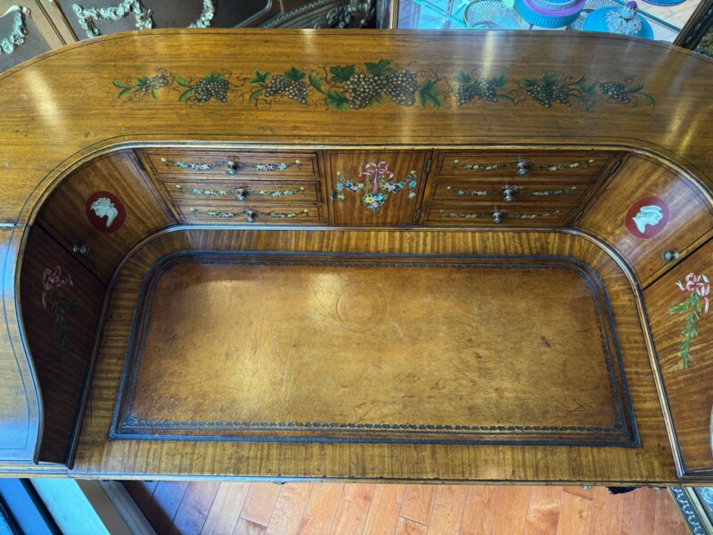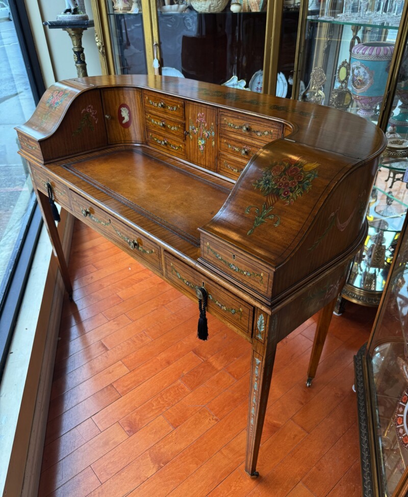 This splendid English Edwardian period satinwood Carlton House desk embodies timeless elegance. Delicately hand-painted with charming florals and swags, its intricate design extends gracefully across the top, drawers, legs, and back. The leather top extends to provide additional desk space, featuring meticulous tooling for added sophistication. Offering ample storage, the desk features six small drawers flanking a central door, while corner doors and lift-up ends reveal hidden compartments. Three separate drawers adorn the front, enhancing its practicality. With a fully finished back, this desk is versatile enough to be showcased at the center of any room, allowing it to be admired from all angles.