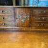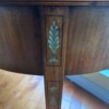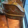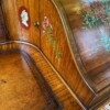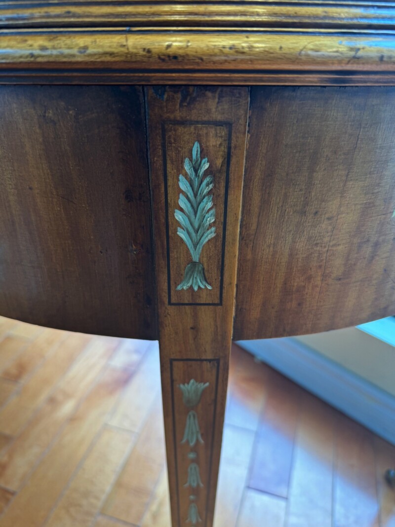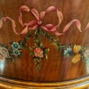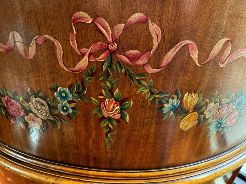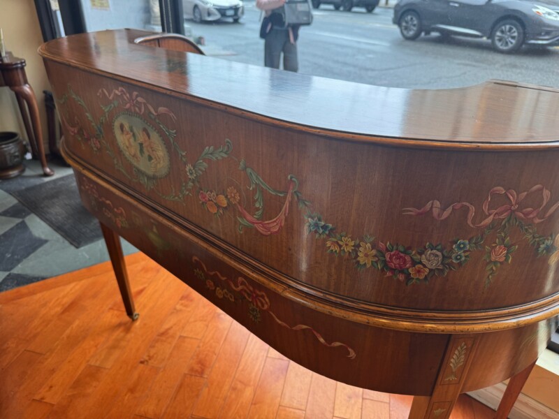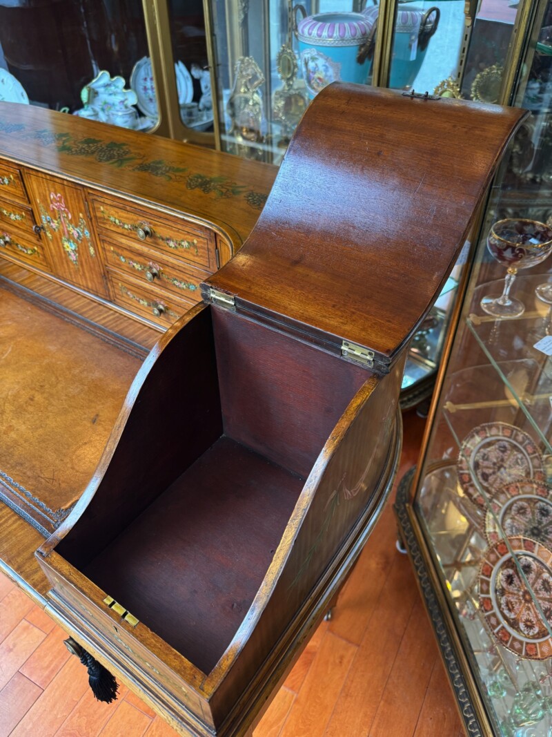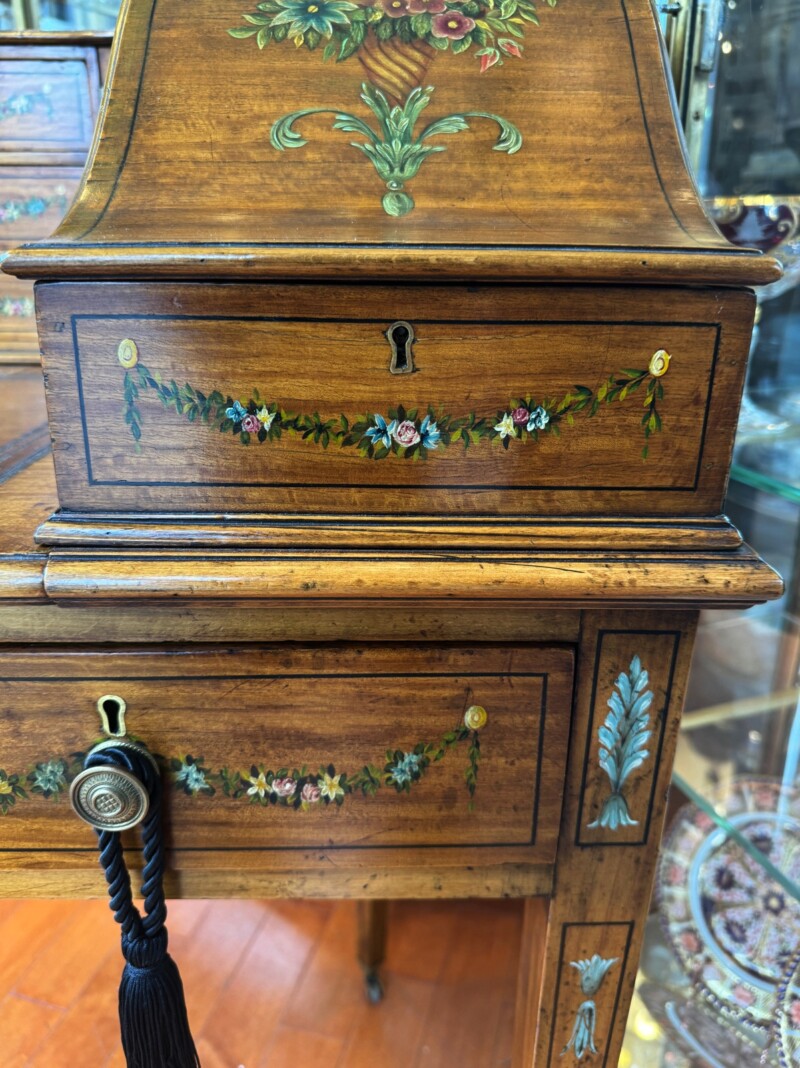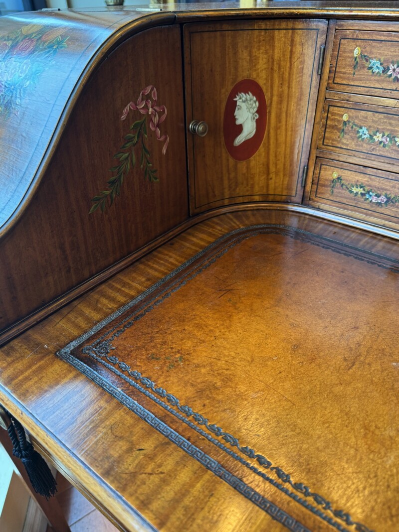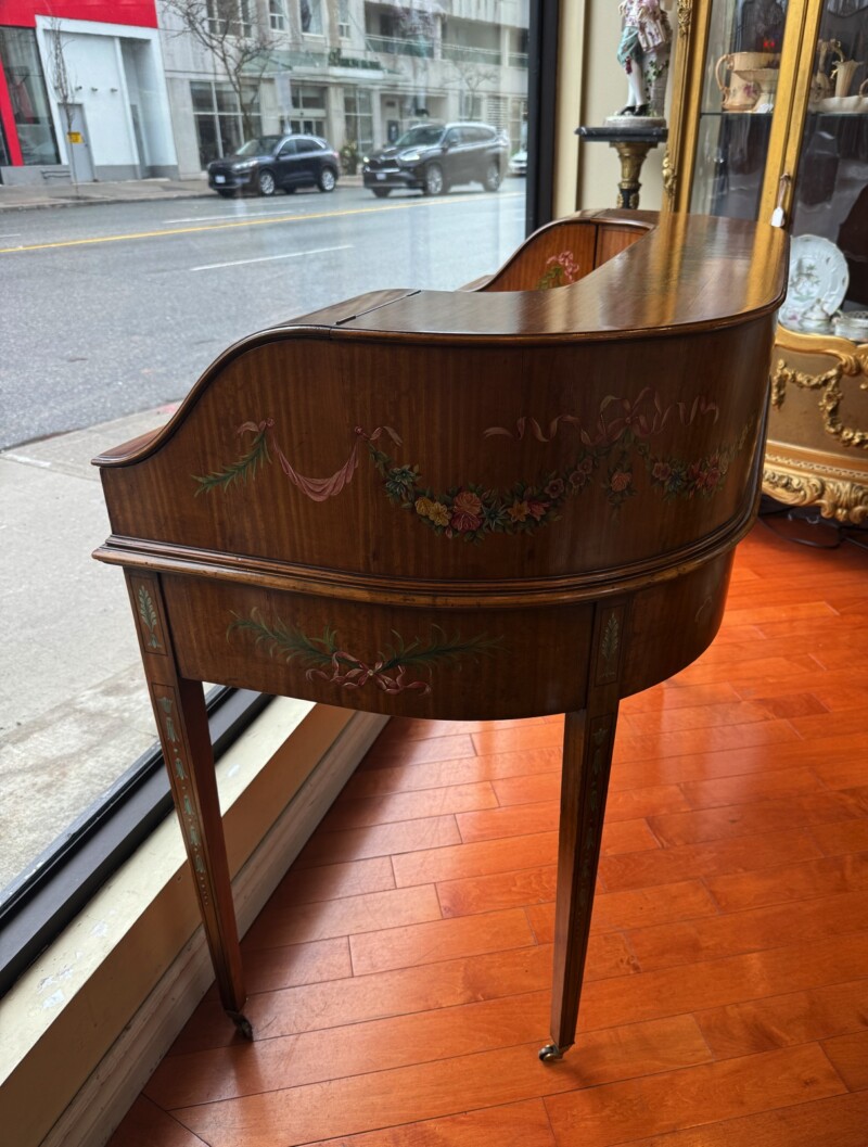 This splendid English Edwardian period satinwood Carlton House desk embodies timeless elegance. Delicately hand-painted with charming florals and swags, its intricate design extends gracefully across the top, drawers, legs, and back. The leather top extends to provide additional desk space, featuring meticulous tooling for added sophistication. Offering ample storage, the desk features six small drawers flanking a central door, while corner doors and lift-up ends reveal hidden compartments. Three separate drawers adorn the front, enhancing its practicality. With a fully finished back, this desk is versatile enough to be showcased at the center of any room, allowing it to be admired from all angles.