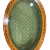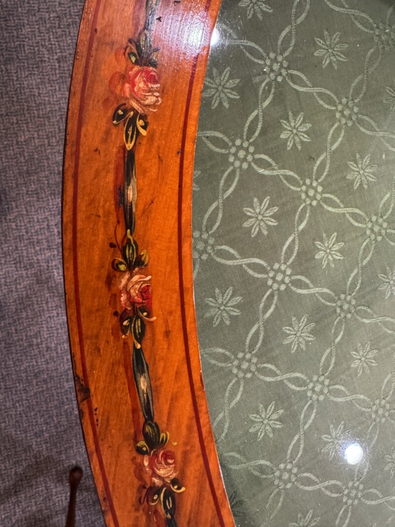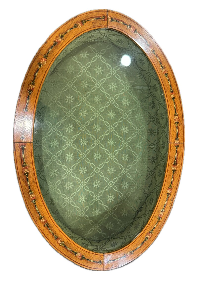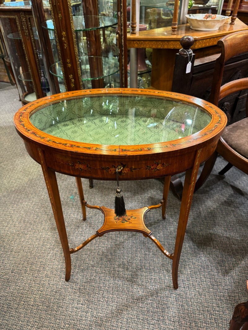 A lovely delicate showcase table in satinwood with hand painted roses all around.  The oval case is lined inside with fabric to display a small collection and there is a functioning lock and key.