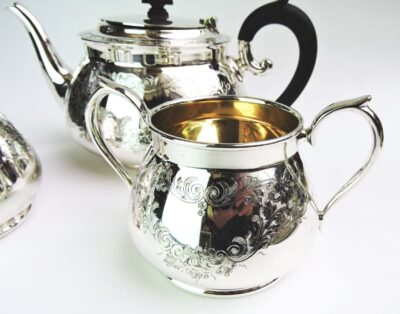 Simpson, Hall, Miller was known for its highly decorative silver-plated wares, which drew on a variety of popular Victorian influences. Designs from this era can include elements from the Aesthetic Movement, like detailed engravings of flowers and birds. This set is a fine example of Simpson Hall & Miller and in excellent condition.