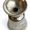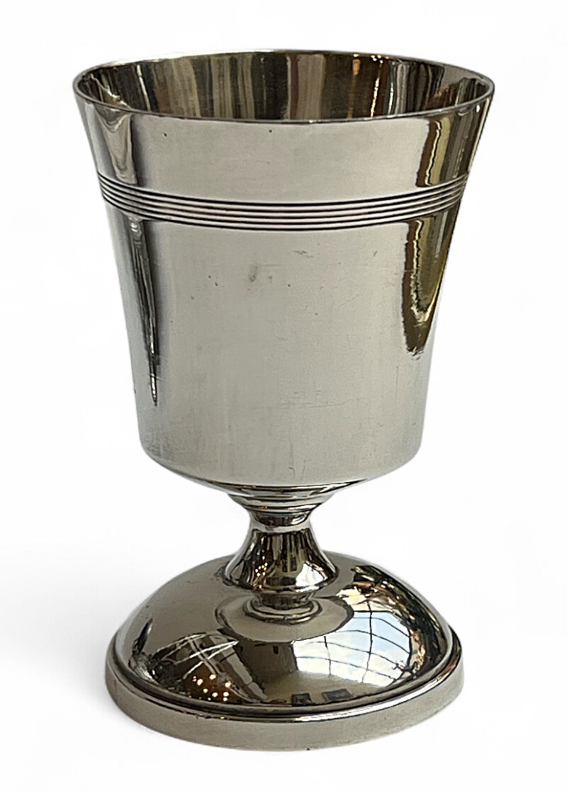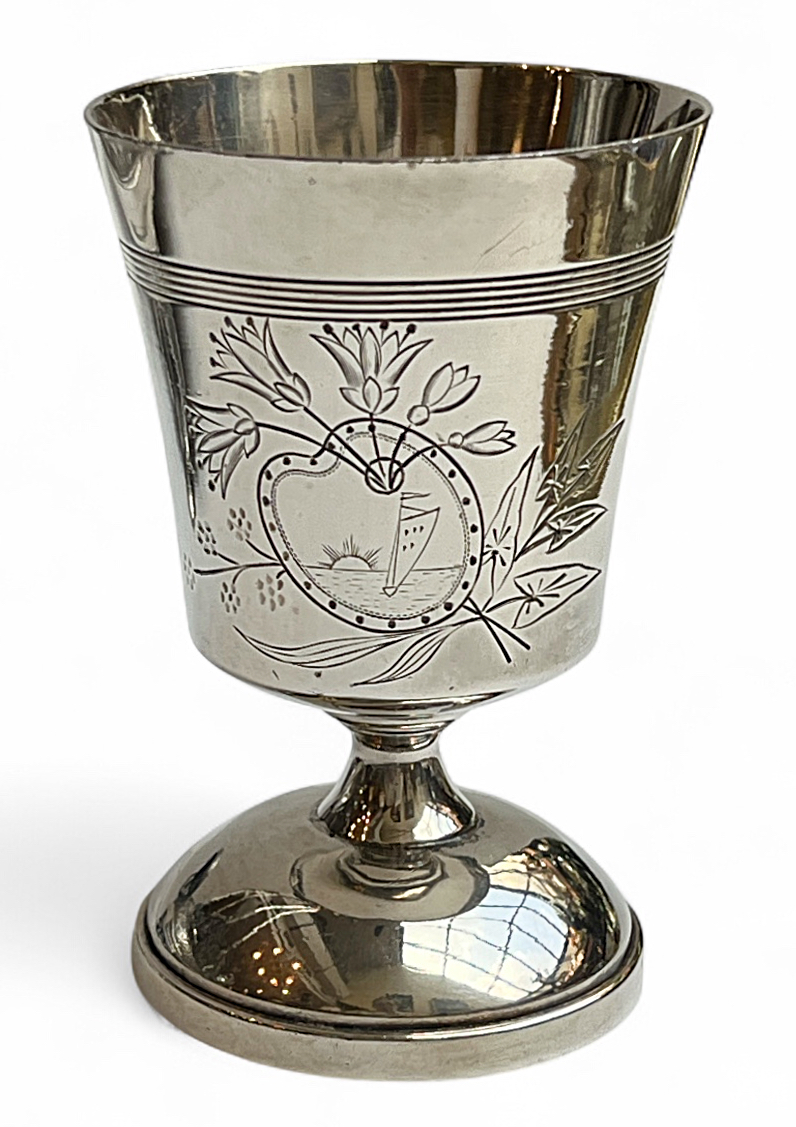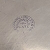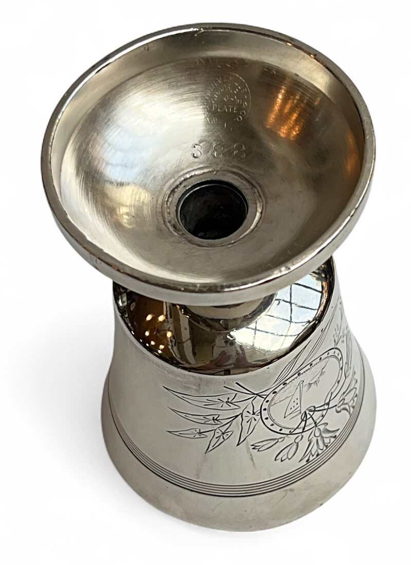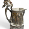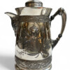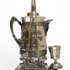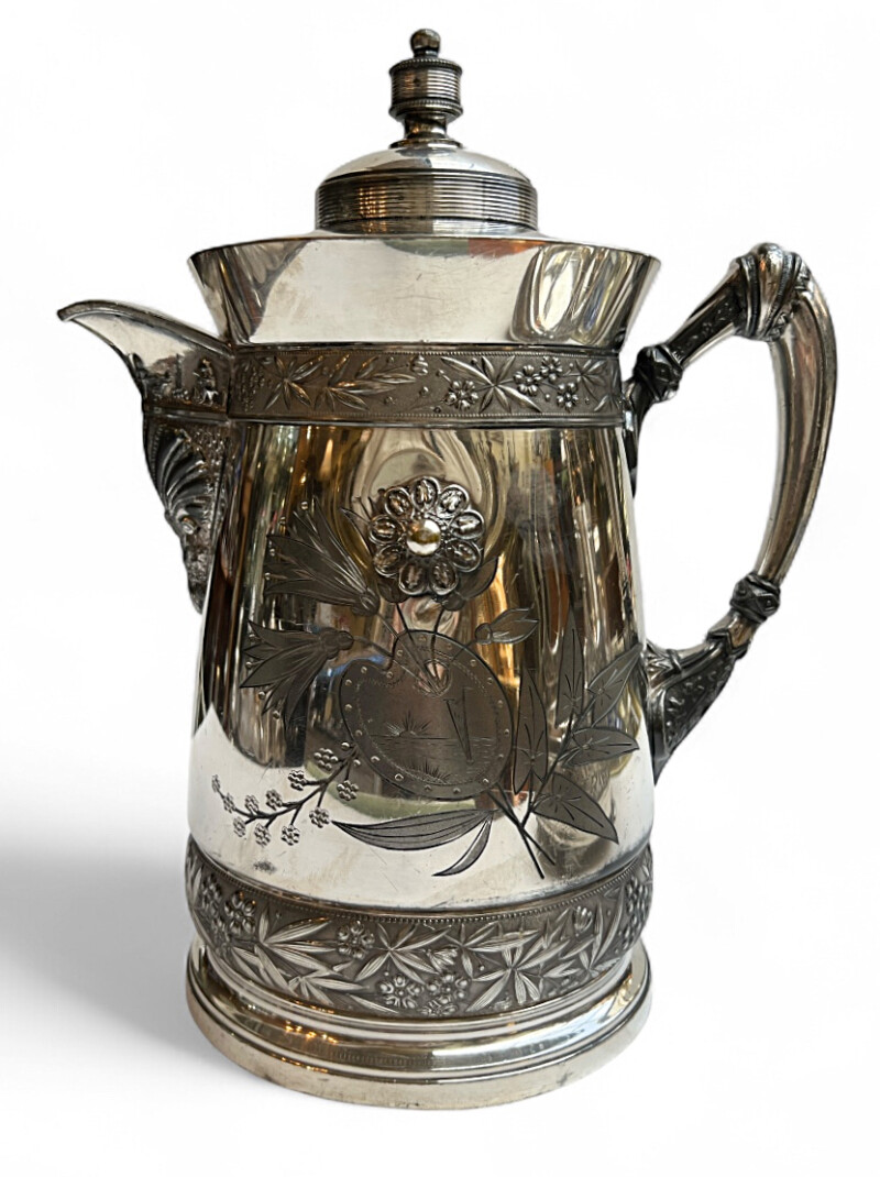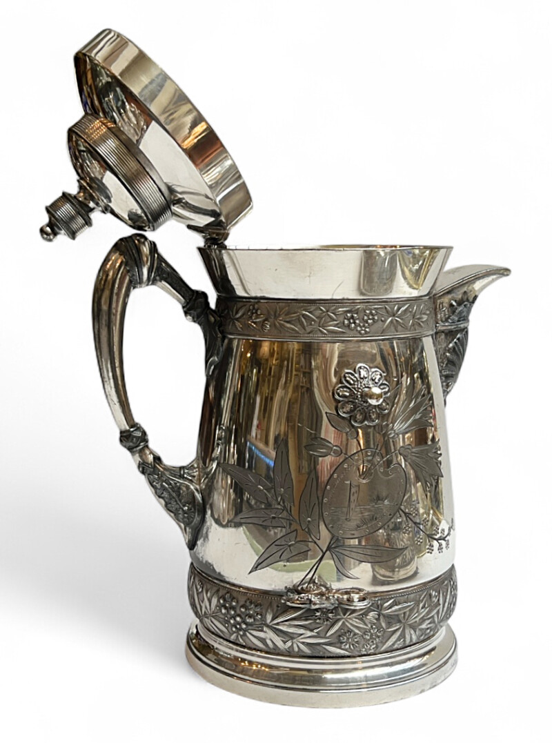 The large serving pitcher has a hinged lid and side panels with amazing engraving details depicting an “artist palette with a scenic water landscape” surrounded by “lily pad floral” images, which are repeated in the serving cup. The stand also features a ring at the base to hold the serving cup. The removable center of the stand is clearly engraved on the reverse with Simpson, Hall, Miller & Co.