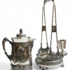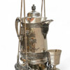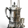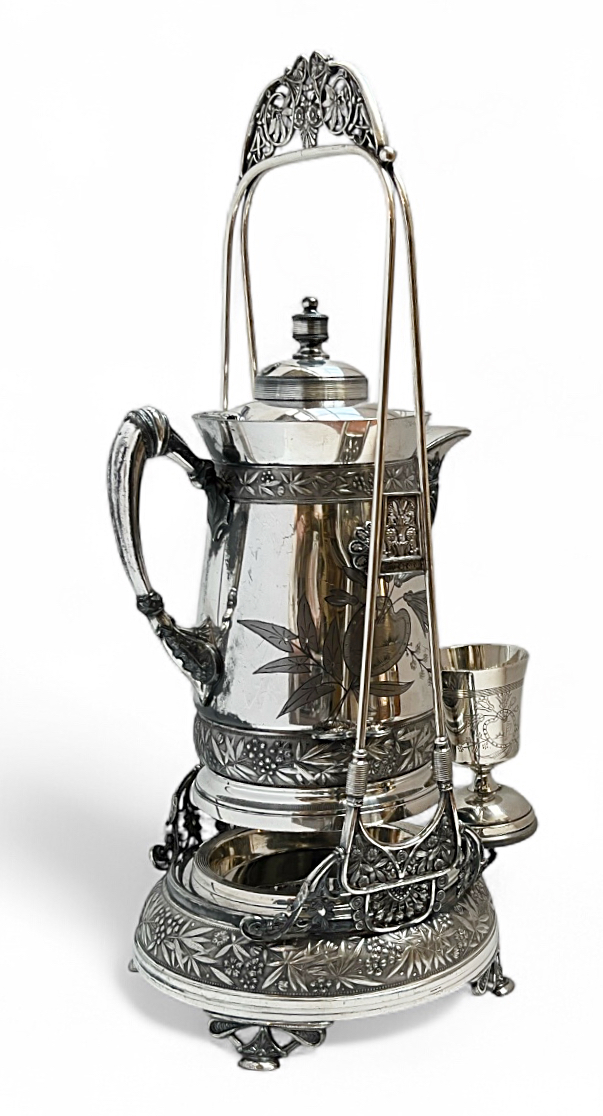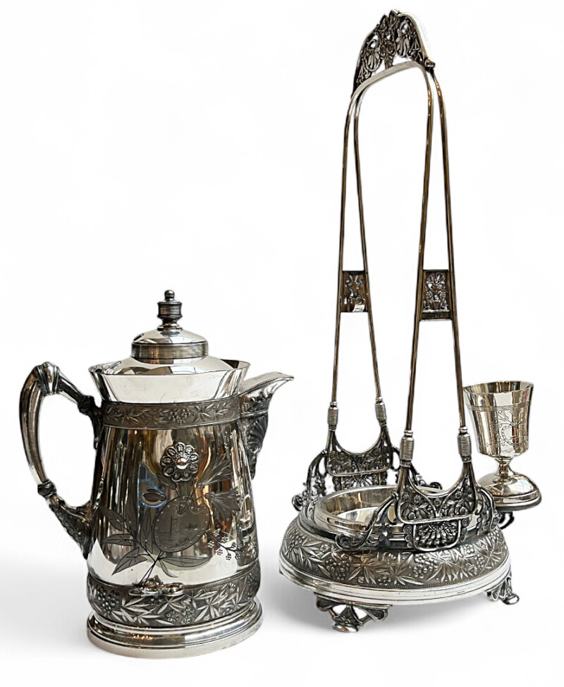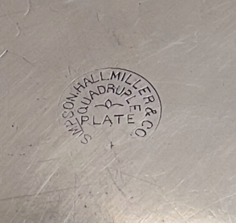 Silver HollowareAn American Victorian tipping or tilting ice water or lemonade set with pitcher, stand and cup by Simpson, Hall, Miller & Co., a manufacturer based in Connecticut and founded in 1866. By c. 1895 the company operated large factories in Wallingford, and Montreal Canada. The company was highly regarded and won awards at international exhibitions, including the Philadelphia Centennial Exhibition in 1876. Their designs have been collected by many American museums, and shown worldwide.