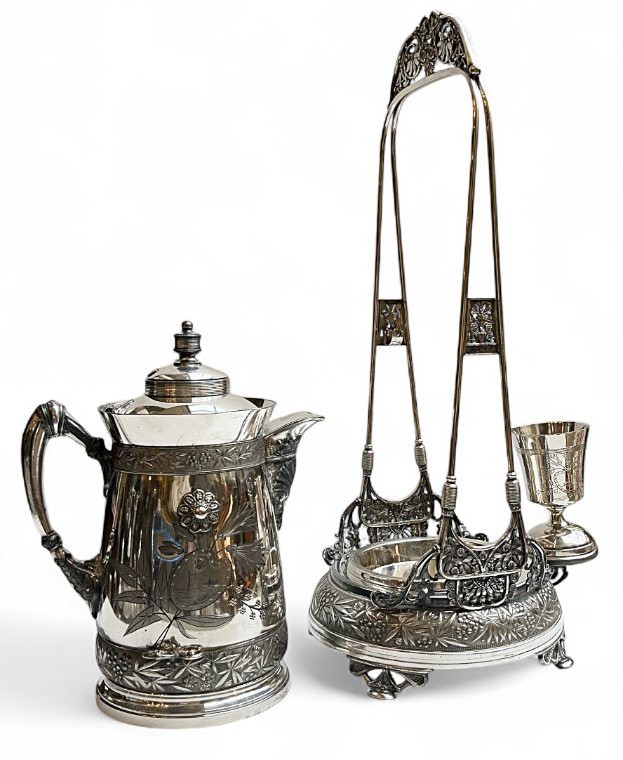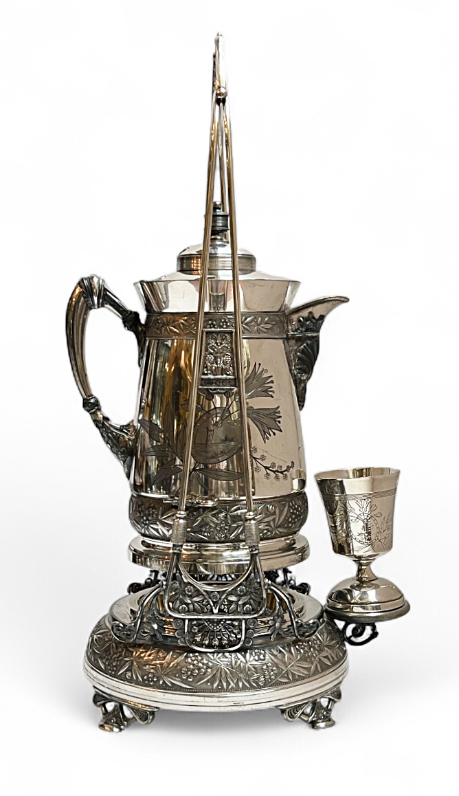 Elaborate & Sumptuous American Victorian Era Silver Plated & Engraved Tipping Ice Water or Lemonade Pitcher, Stand & Cup, by Renowned Simpson Hall & Miller, Circa 1880