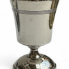 This gorgeous Victorian silver plated tipping set is composed of a sturdy silver plated stand, a large tipping pitcher and a large goblet. The serving pitcher rests on a stand with a hinge that allows it to be suspended and tipped forward for pouring. The design prevents the server from having to lift a heavy, liquid-filled pitcher. The stand has a substantial round base that is tiered and decorated with stylized panels on either side that extend upward to form an arched top panel decorated with an open weave silver floral foliate motif. The wide bands of floral decoration around the base are repeated twice more in the pitcher design.