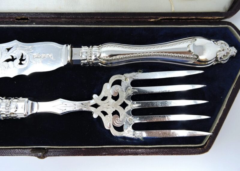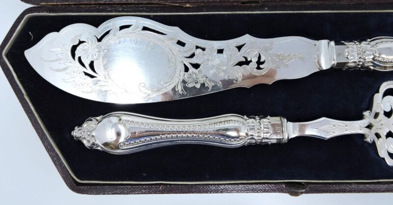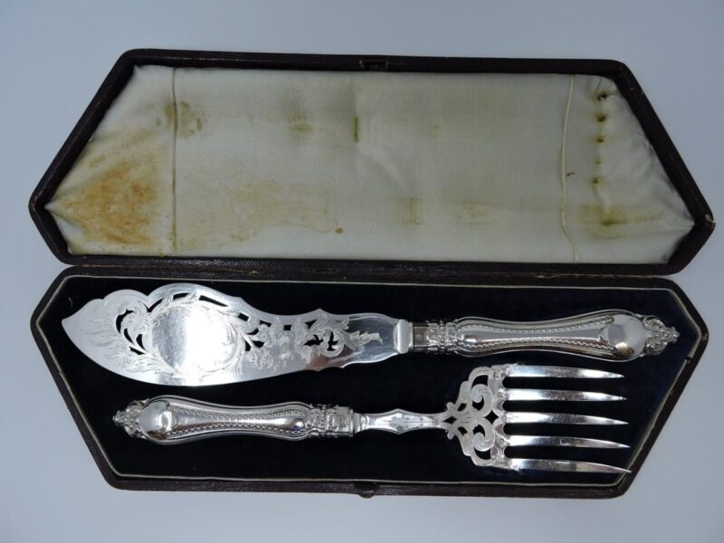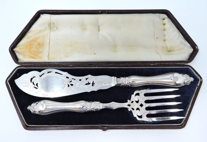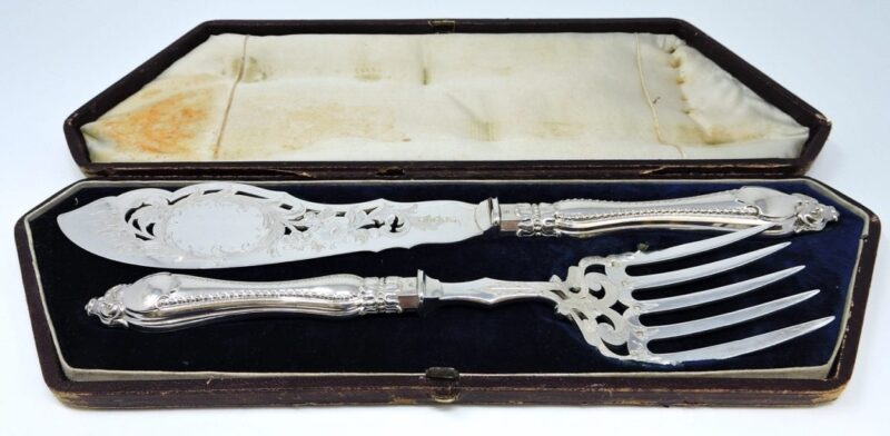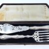 Elegant English Silver-Plated Fish Servers in Original Leather Case – Martin, Hall & Co. – circa 1880.