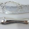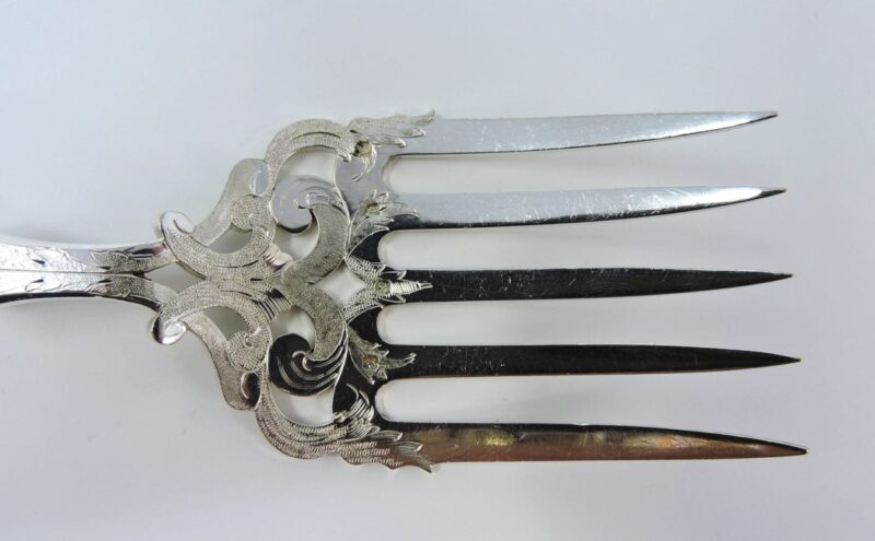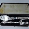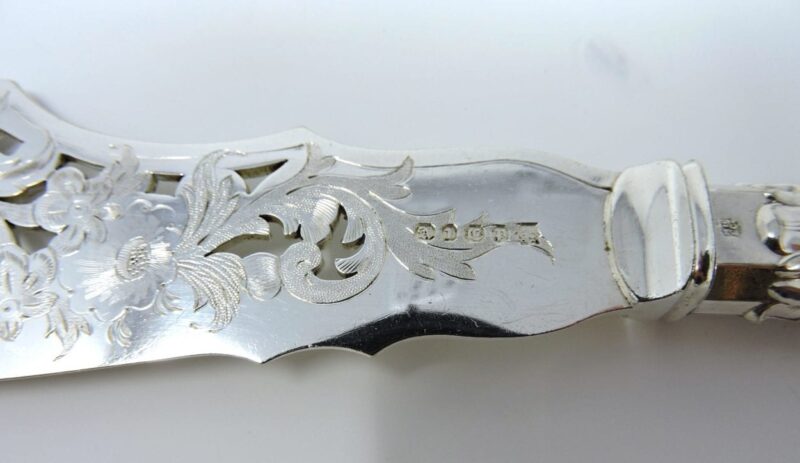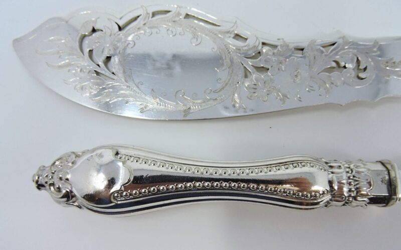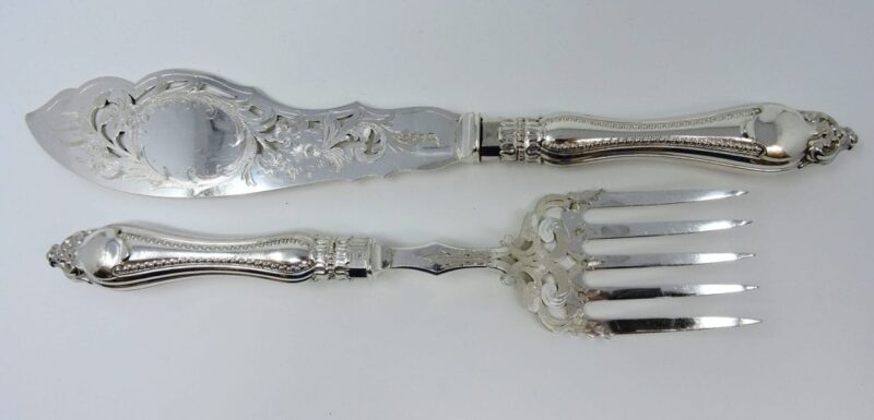 v** SOLD ARCHIVES **vHere is a lovely English silver-plated fish serving set (knife and fork). Both pieces are ornately decorated with floral designs and the knife is stamped on one side of the blade with the maker’s marks.