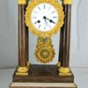 The Empire case consists of four, high polish, rosewood, neo-classical pillars mounted to a rectangular plinth and crowned with a rectangular lintel. Gilt bronze fittings with foliate ornament and scrollwork are positioned on the top and bottom columnar supports, around the face and on the pendulum.
