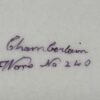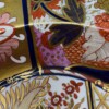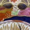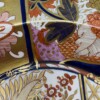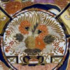 In the central image is an enchanting scene of a beautiful rich cobalt blue vase with a flowing gorgeous bouquet of flowers and a foreground of iron red concentric circles. The rim has alternating panels that are richly decorated. The smaller panels are gold or gilt with Japanese kamons that alternate with larger panels of intensely detailed fine images of “stylized flowers” and patterns in iron red, pink and gilt. In a few of the large panels, two teal-coloured ibises and a pink “lion” are “in hiding”. The plates are entirely uniquely hand-painted, meaning each plate is slightly different, even the Chamberlain signature is by hand and marked ” Chamberlains Worcester No. 240″ .