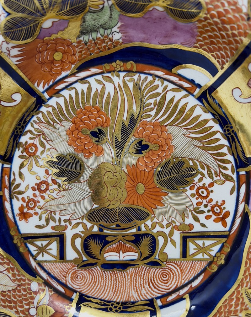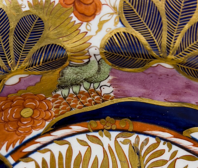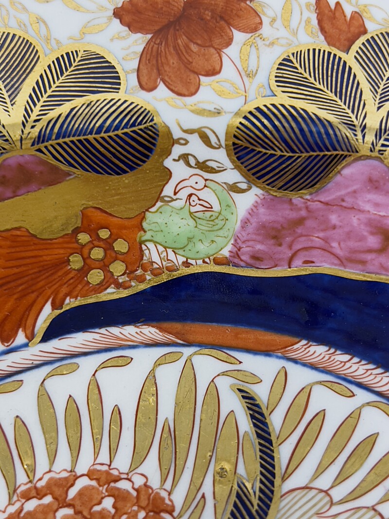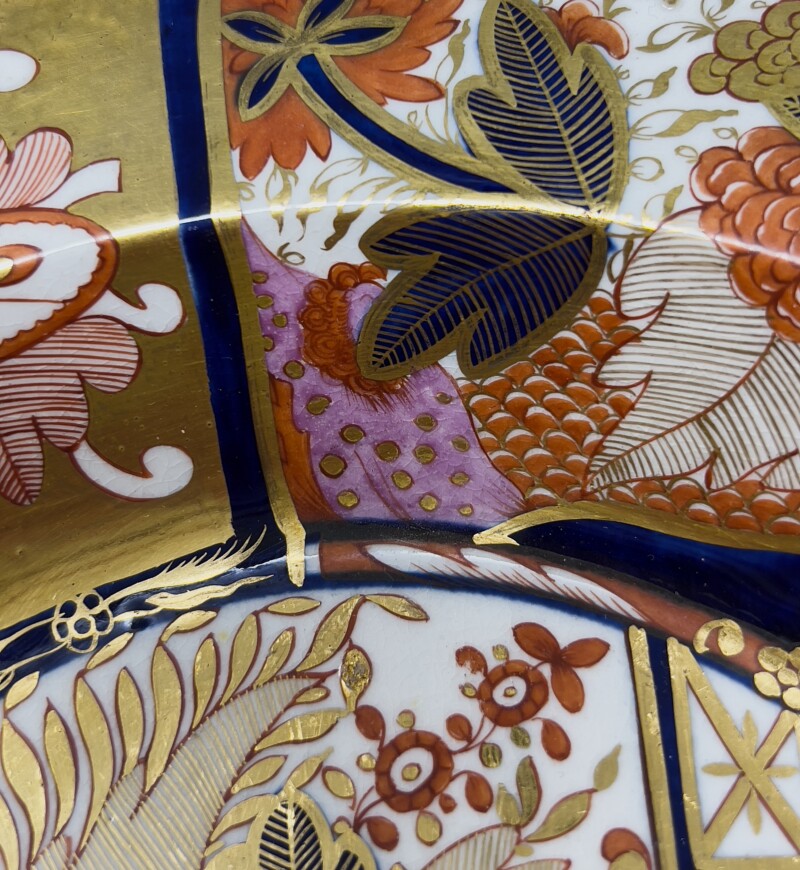 The decoration is a beautiful example of the Regency “Japan” style from the early 19th Century; the gloriously colourful and intriguing pattern is one of the many “Japan” patterns that came out around that time and was called the “Fine Old Japan” pattern from 1802. This pattern forms the basis of the design ordered by Admiral Lord Nelson’s “Horatia” service. He ordered an entire service in the pattern (but with the additions of his own crests) and therefore it is often called the “Nelson” pattern.